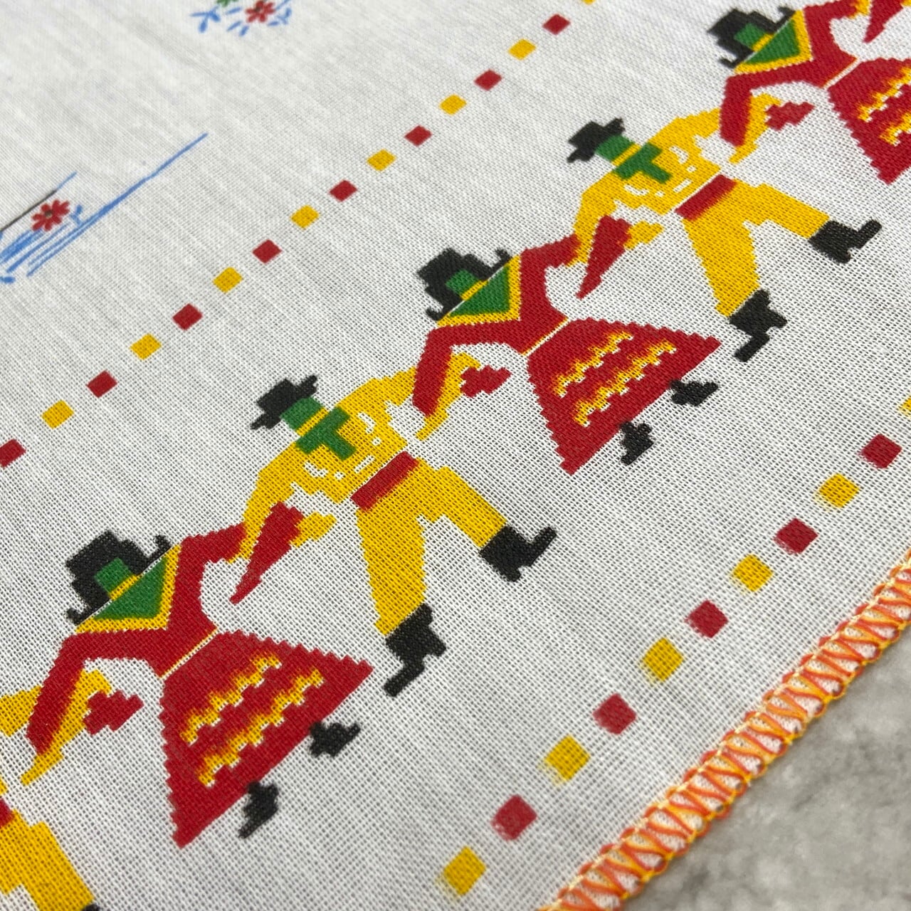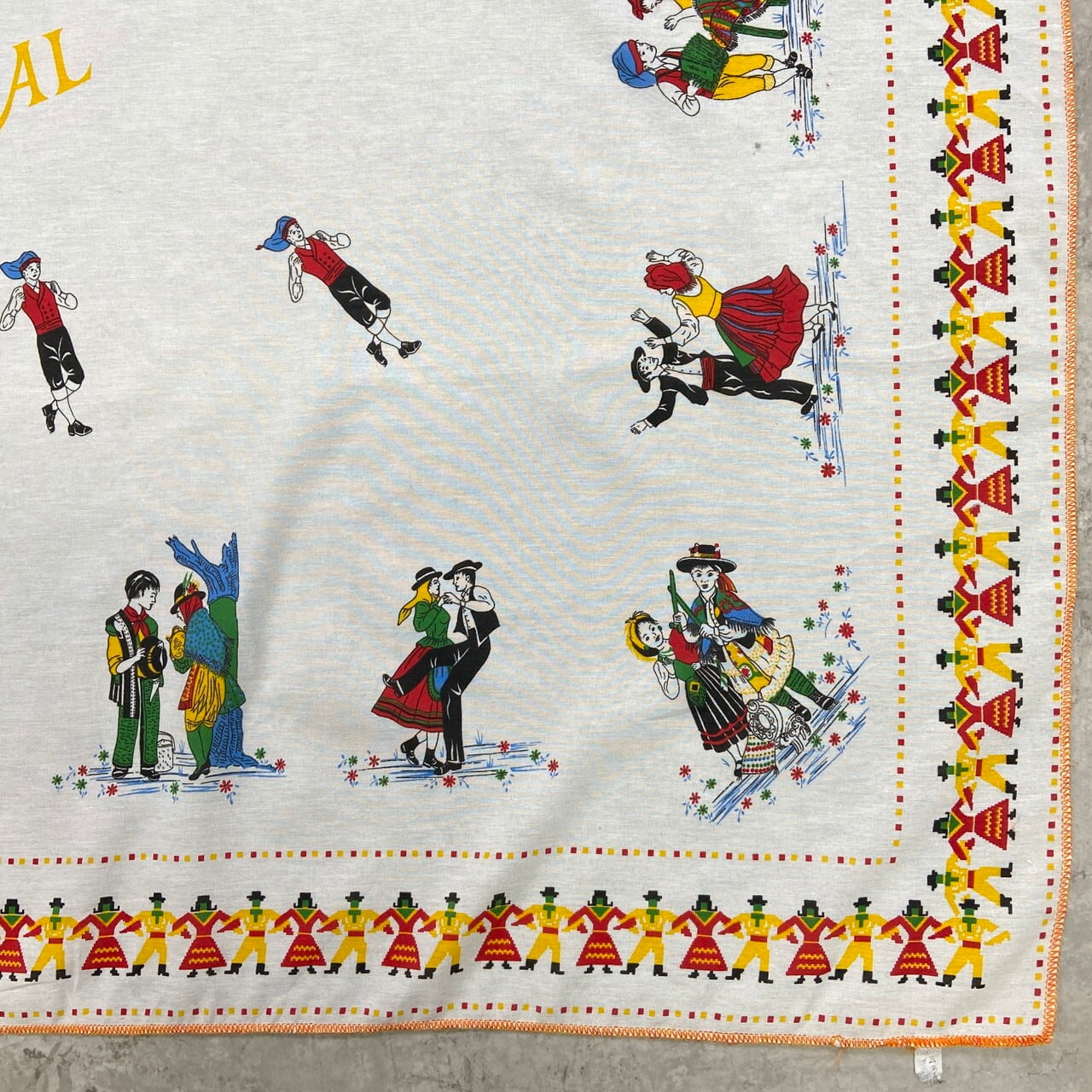 ■ポルトガル製 ヴィンテージ 大判テーブルクロス 134×145cm / 幸運を呼ぶ雄鶏「ガロ」と民族衣装 / フォークアート インテリア【テーブルクロス】 /マルチカラー