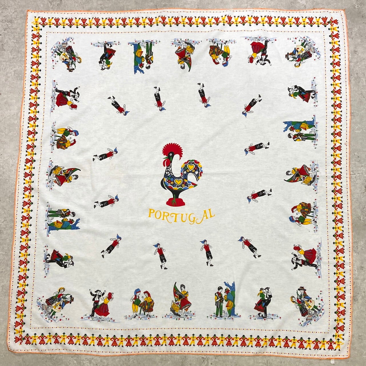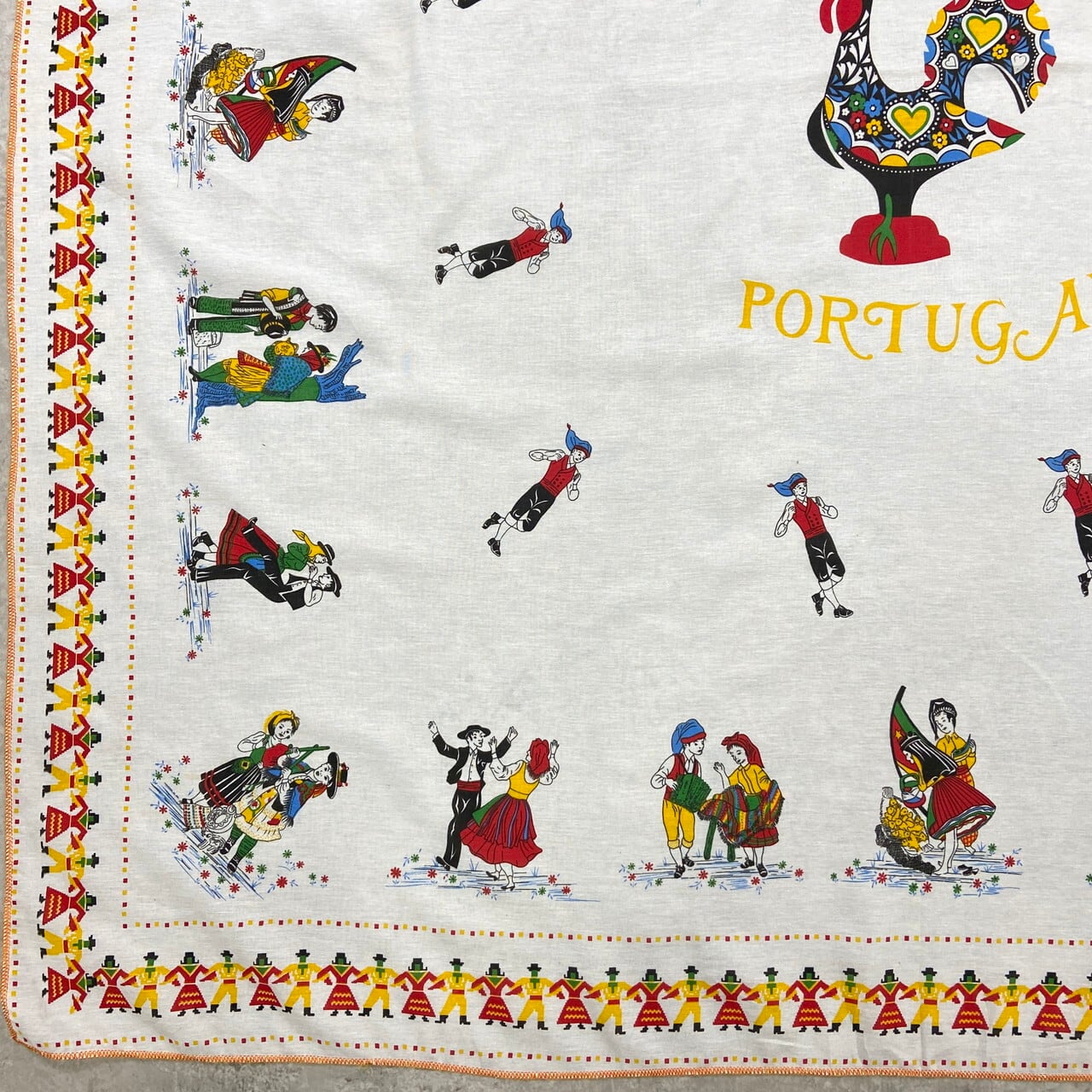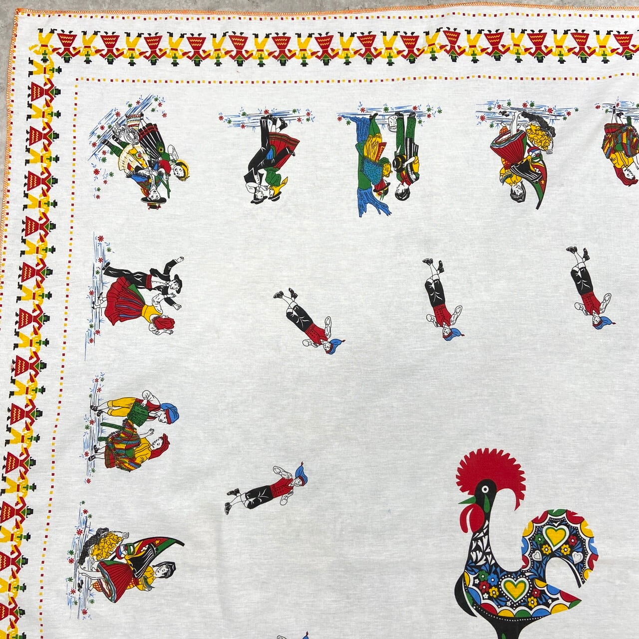 ポルトガル製 ヴィンテージ 大判テーブルクロス 134×145cm / 幸運を呼ぶ雄鶏「ガロ」と民族衣装 / フォークアート インテリア【テーブルクロス】 /マルチカラー