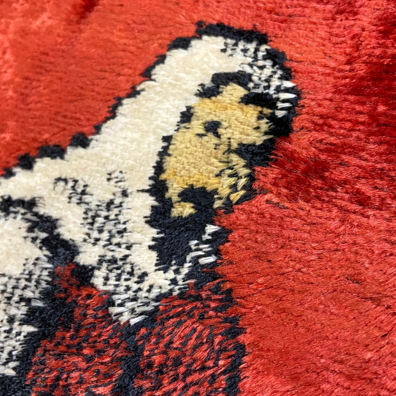 モチーフは「活気あふれるオリエンタルの市場(バザール)」。ラクダの旅、商人たちの往来、遠くに見えるモスクなどが、暖かみのある色彩と緻密な織りでドラマチックに描かれています。
