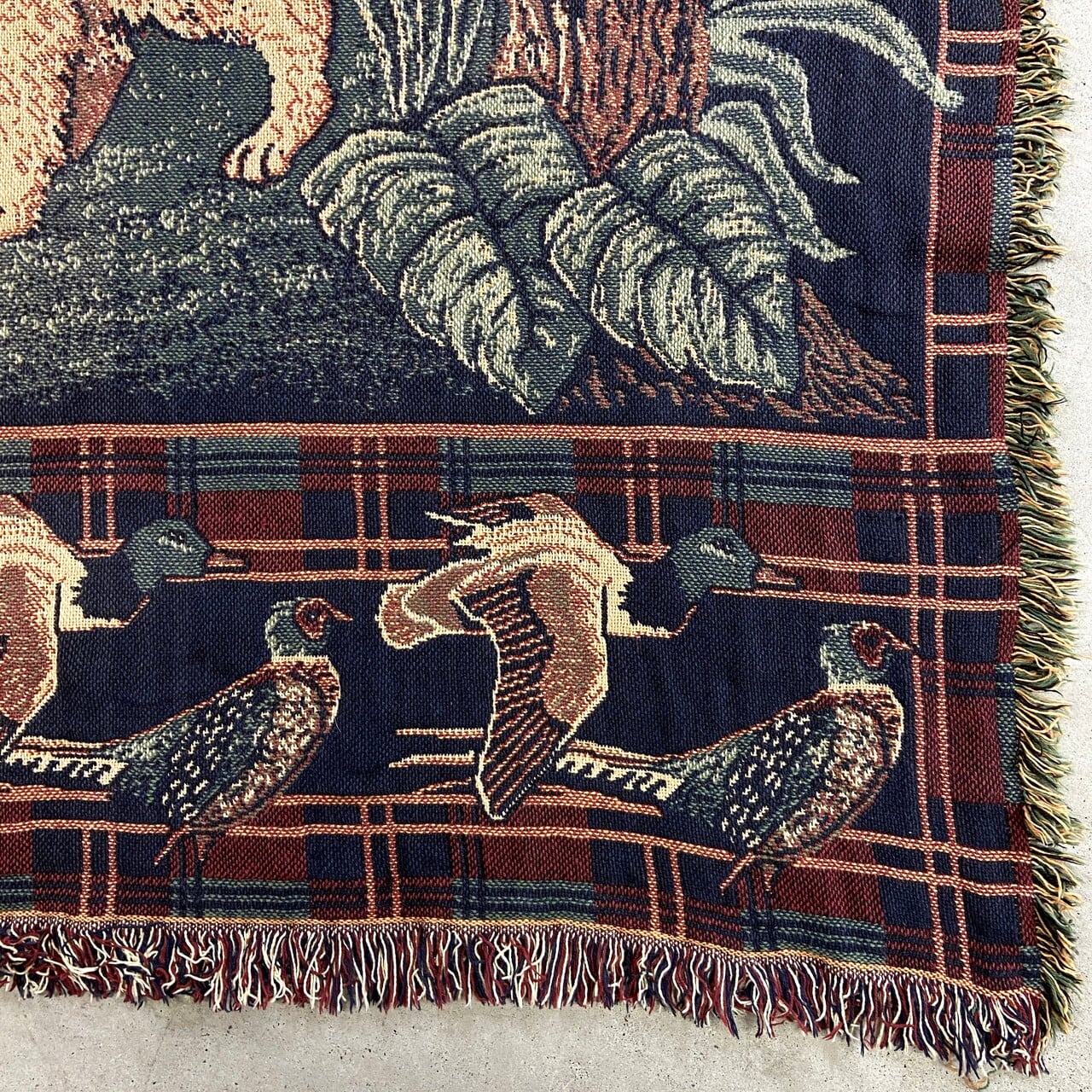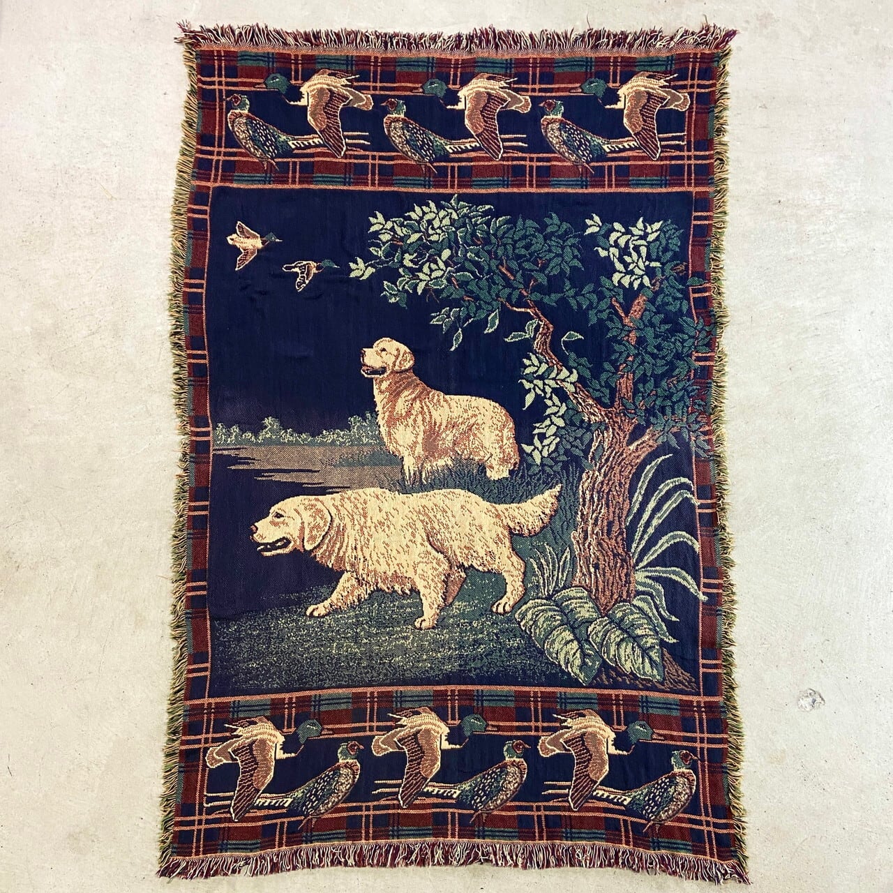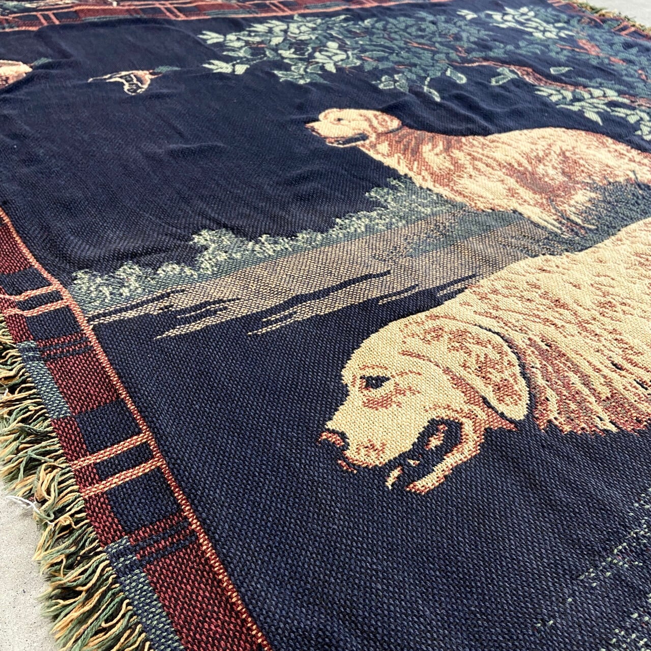 1990年代頃のクラシックな雰囲気が魅力的な、ゴールデンレトリバーと鴨(カモ)が描かれたヴィンテージ・ジャガード織スローケット(マルチカバー)です。