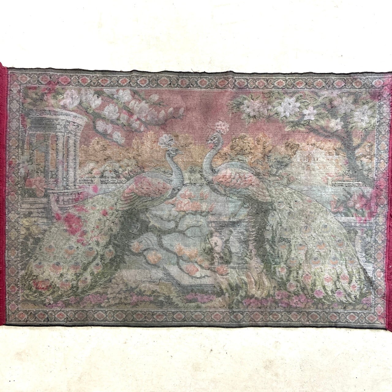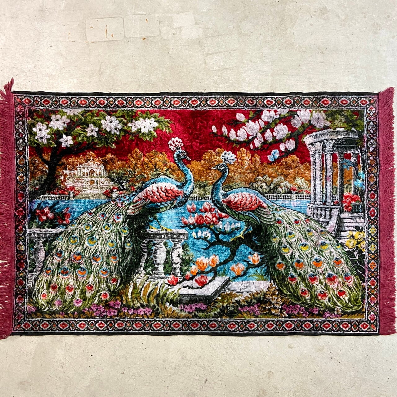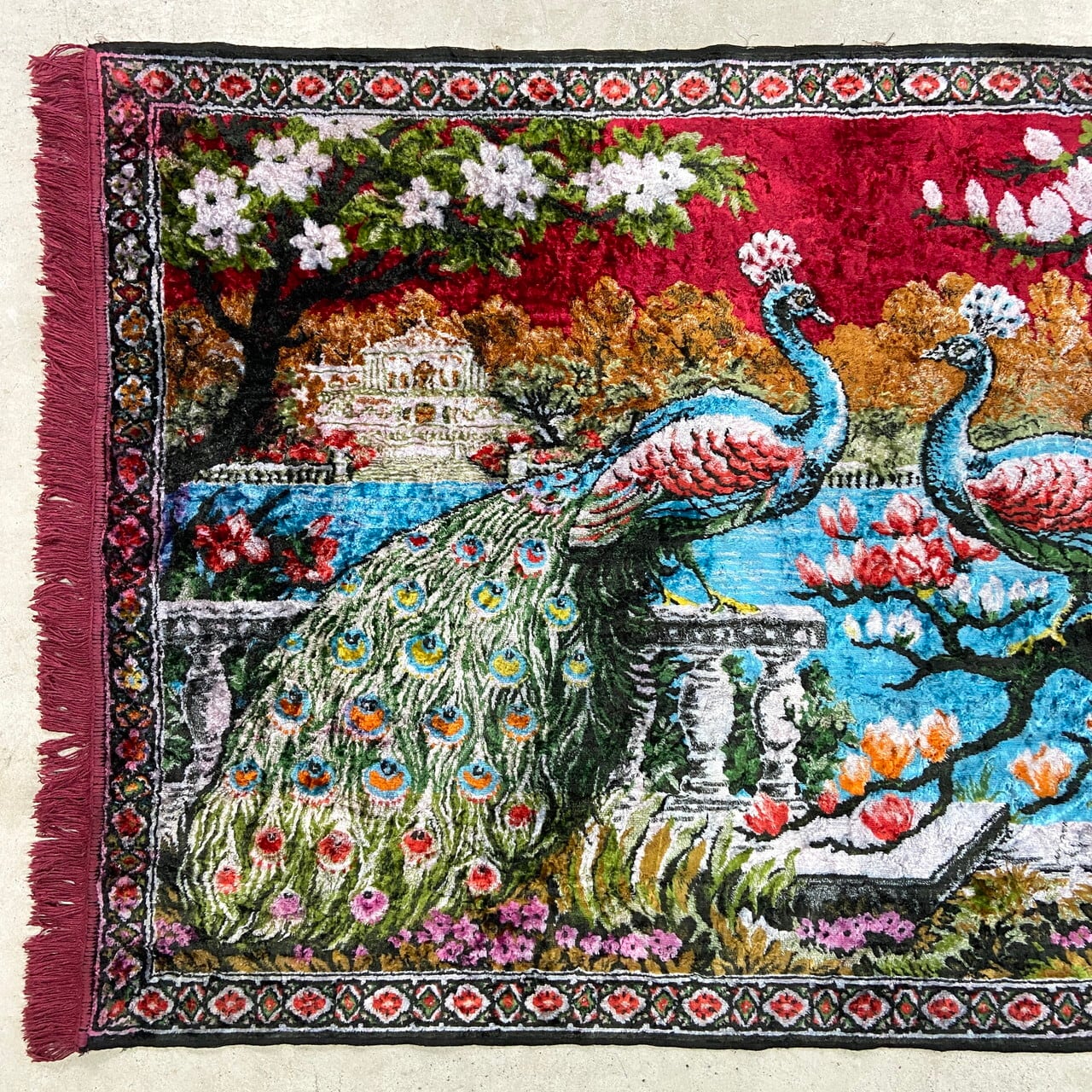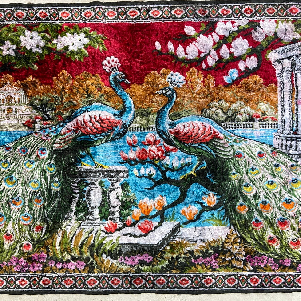 2羽の孔雀が庭園で向かい合う優雅な姿が、鮮やかな色彩とベルベット特有の深い光沢で描かれています。
