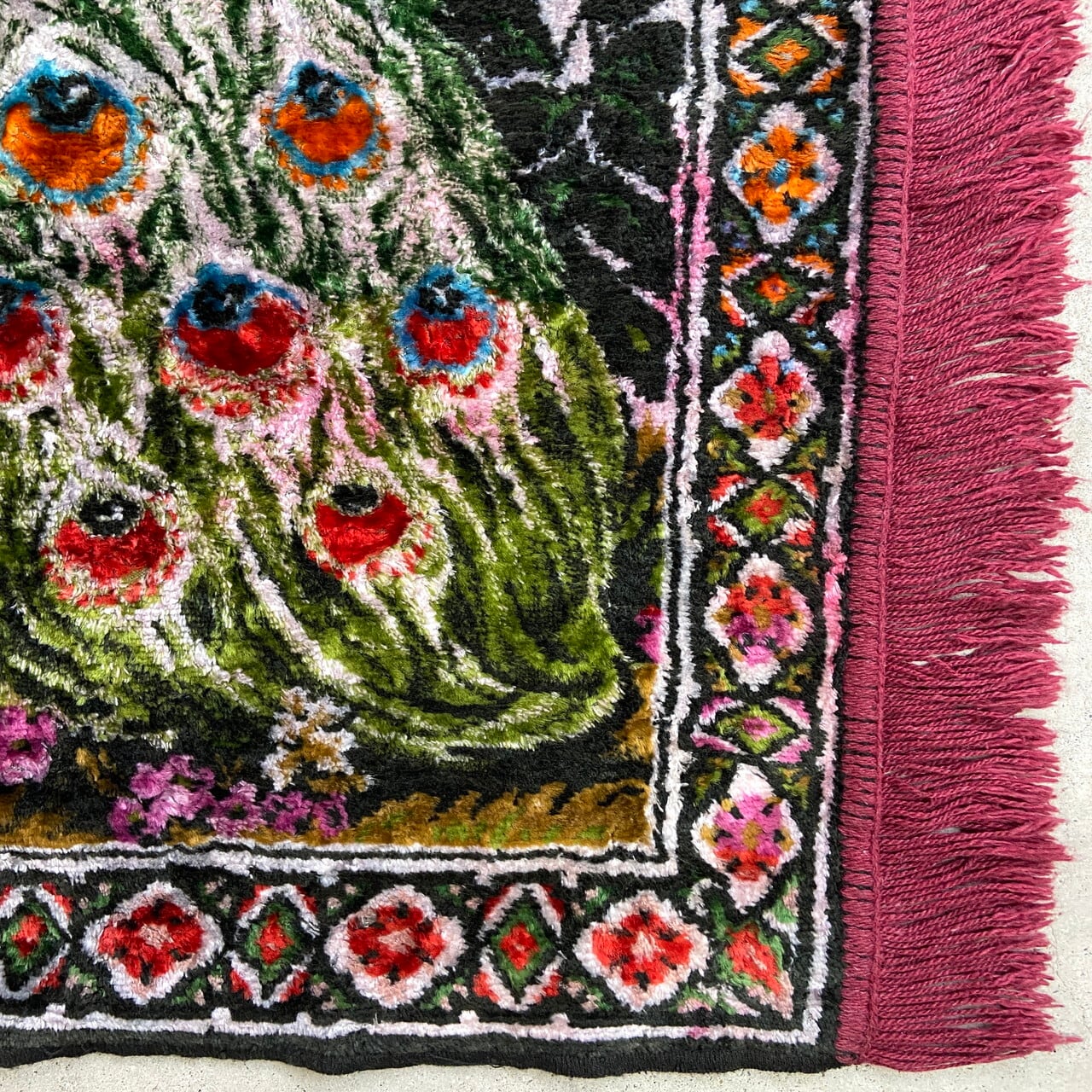 ■訳あり特価 希少大判 70年代頃 ヴィンテージ ベルベット ラグ タペストリー「孔雀 クジャク」 188×114 インテリア 什器 VINTAGE ヴィンテージ ベロア【ラグ】 /マルチカラー