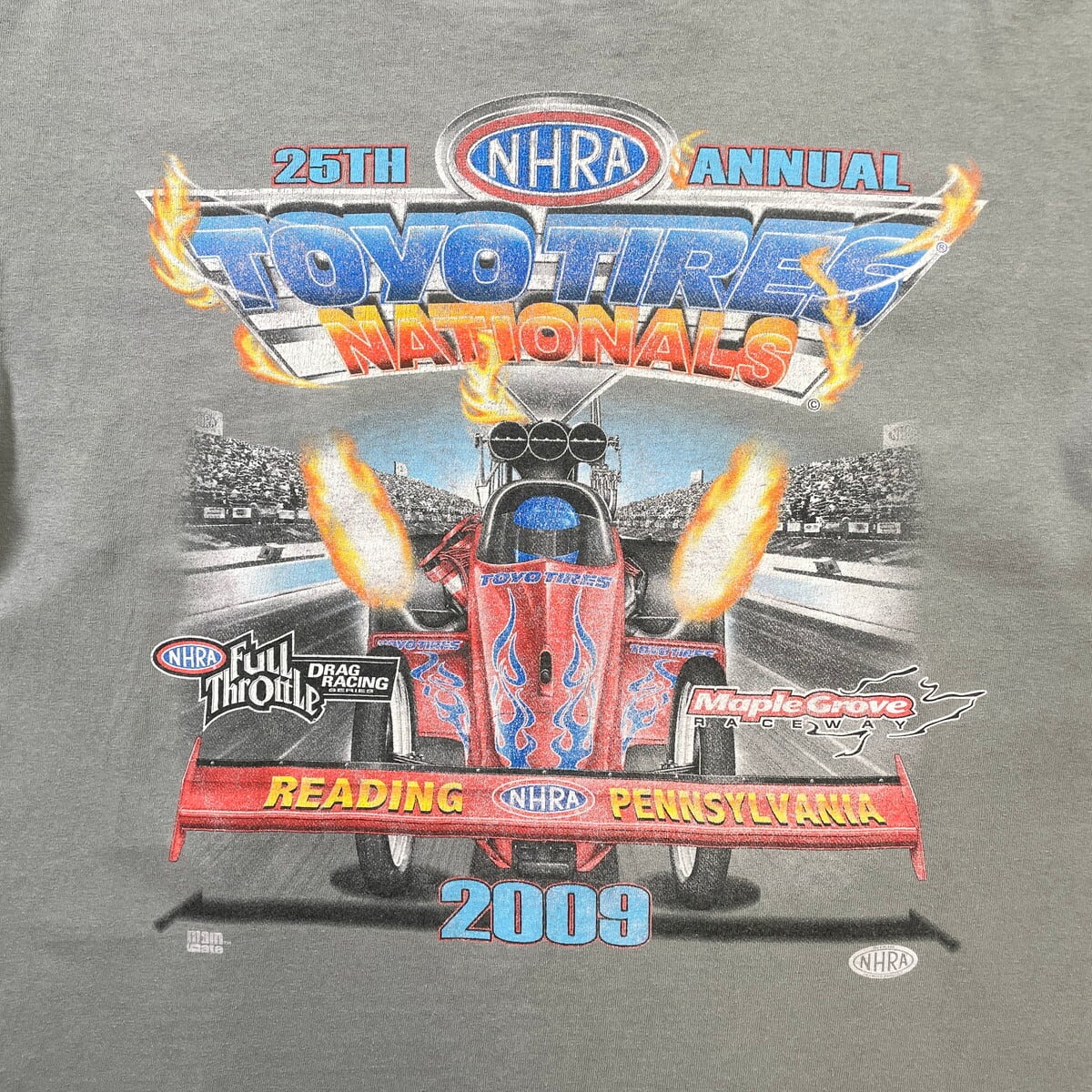 00年代 NHRA TOYOTIRES NATIONALS プリントTシャツ メンズL 古着 00s 2009 Y2K ヴィンテージ VINTAGE 車 バックプリント ライトグレー【Tシャツ】/グレー