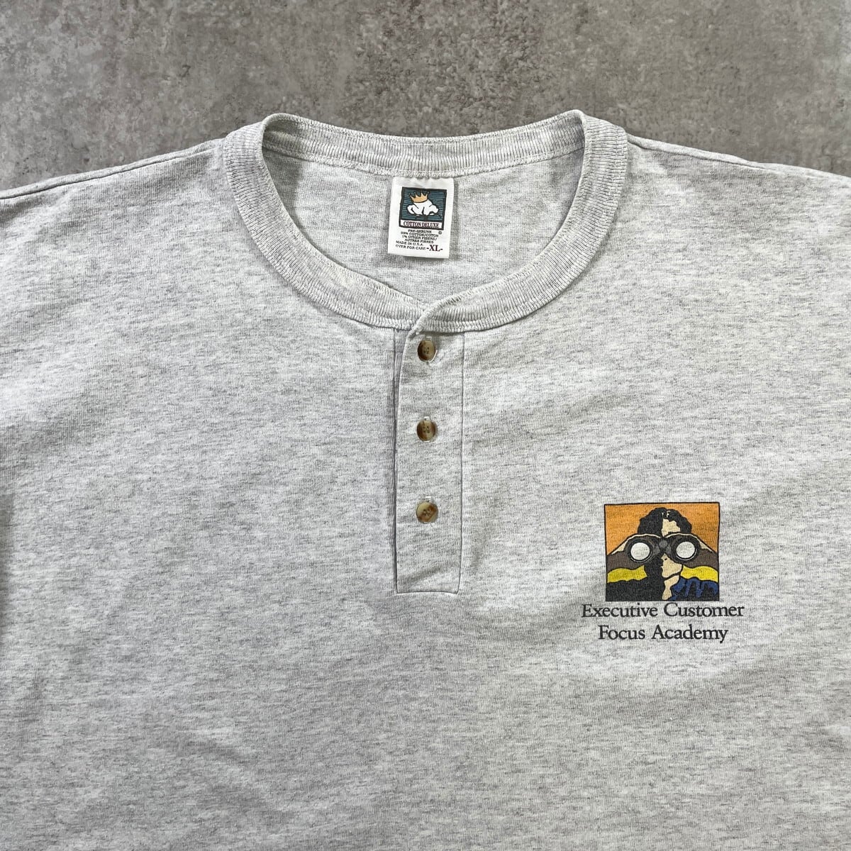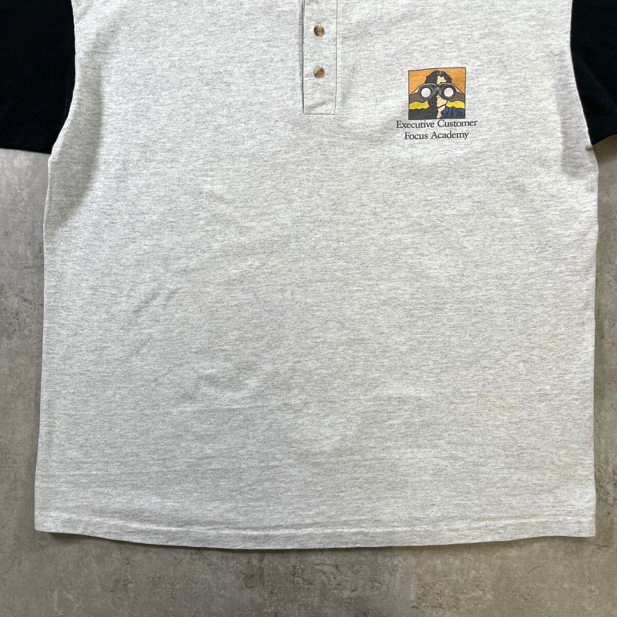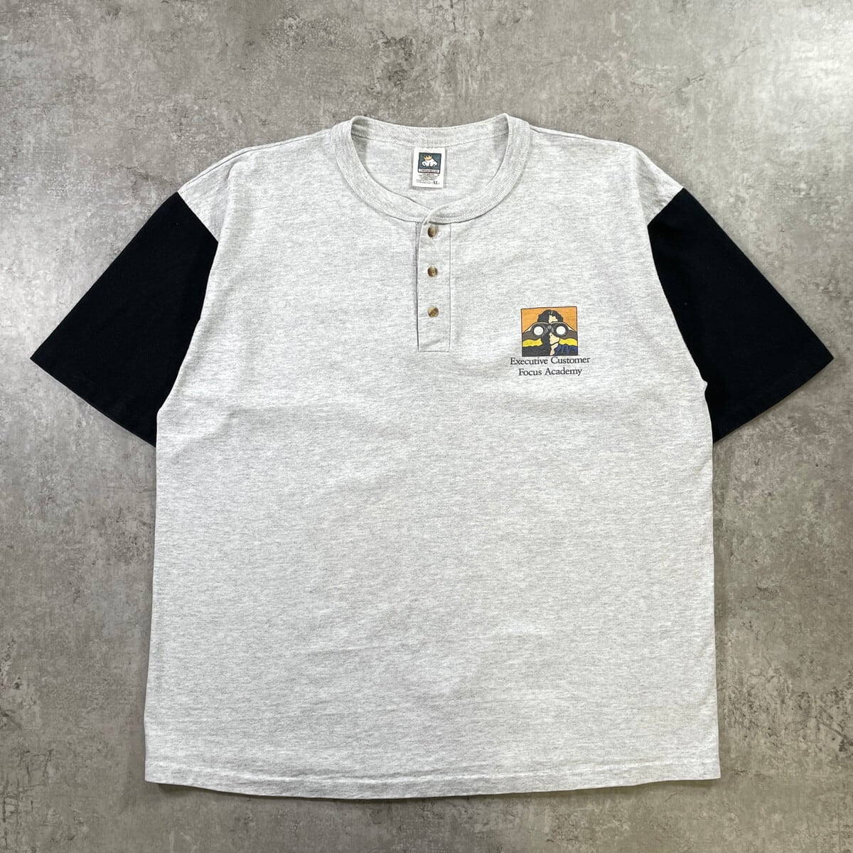 90年代 USA製 ヘンリーネック アートプリントTシャツ メンズXL 古着 90s VINTAGE ヴィンテージ Executive Customer Focus Academy 企業 カレッジ シングルステッチ ツートンカラー ライトグレー ブラック 黒【Tシャツ】/グレー
