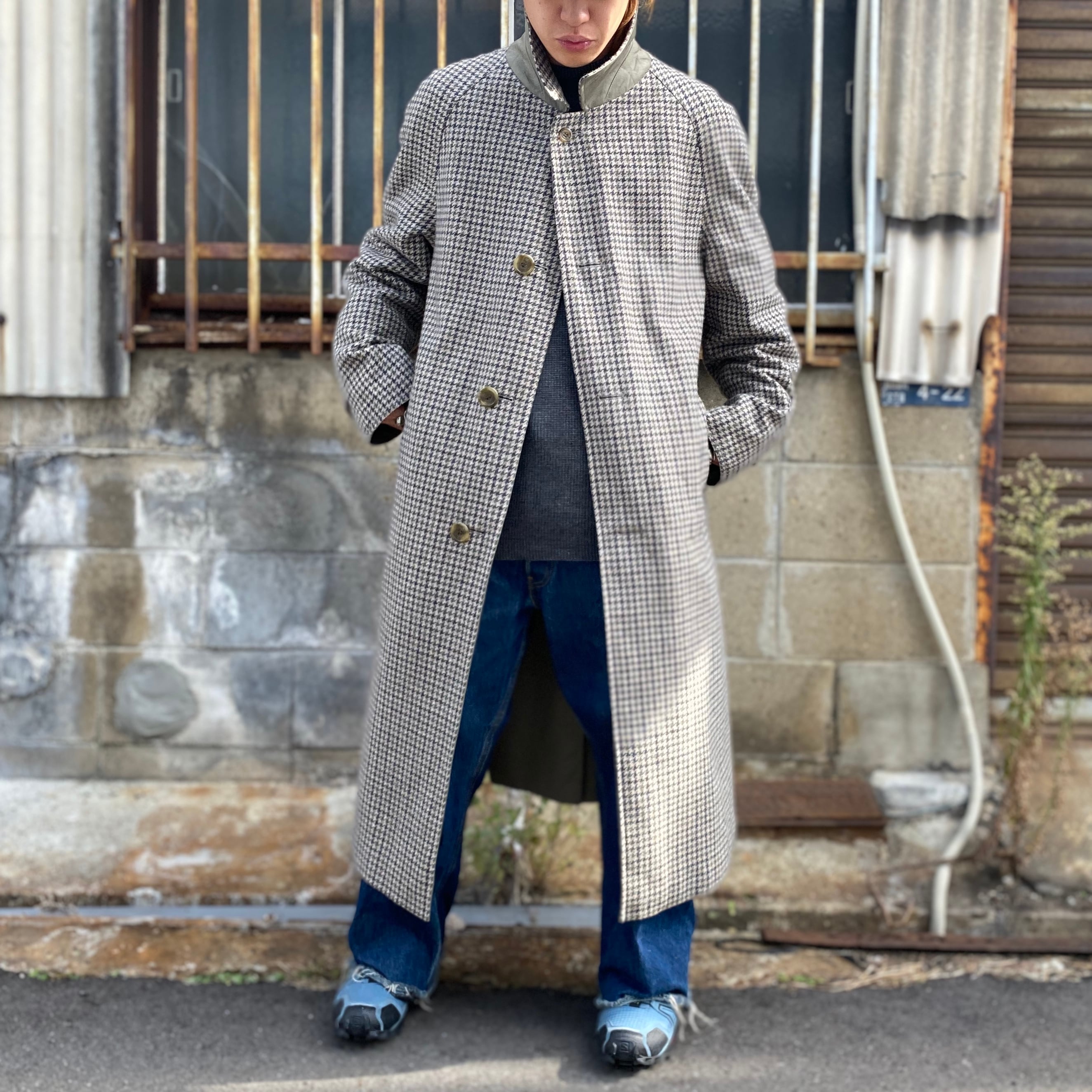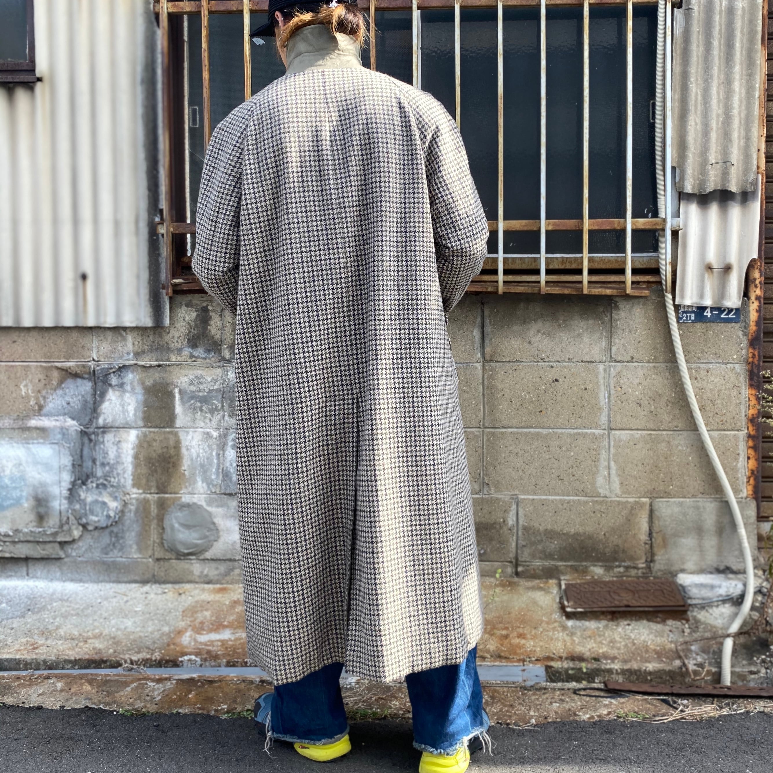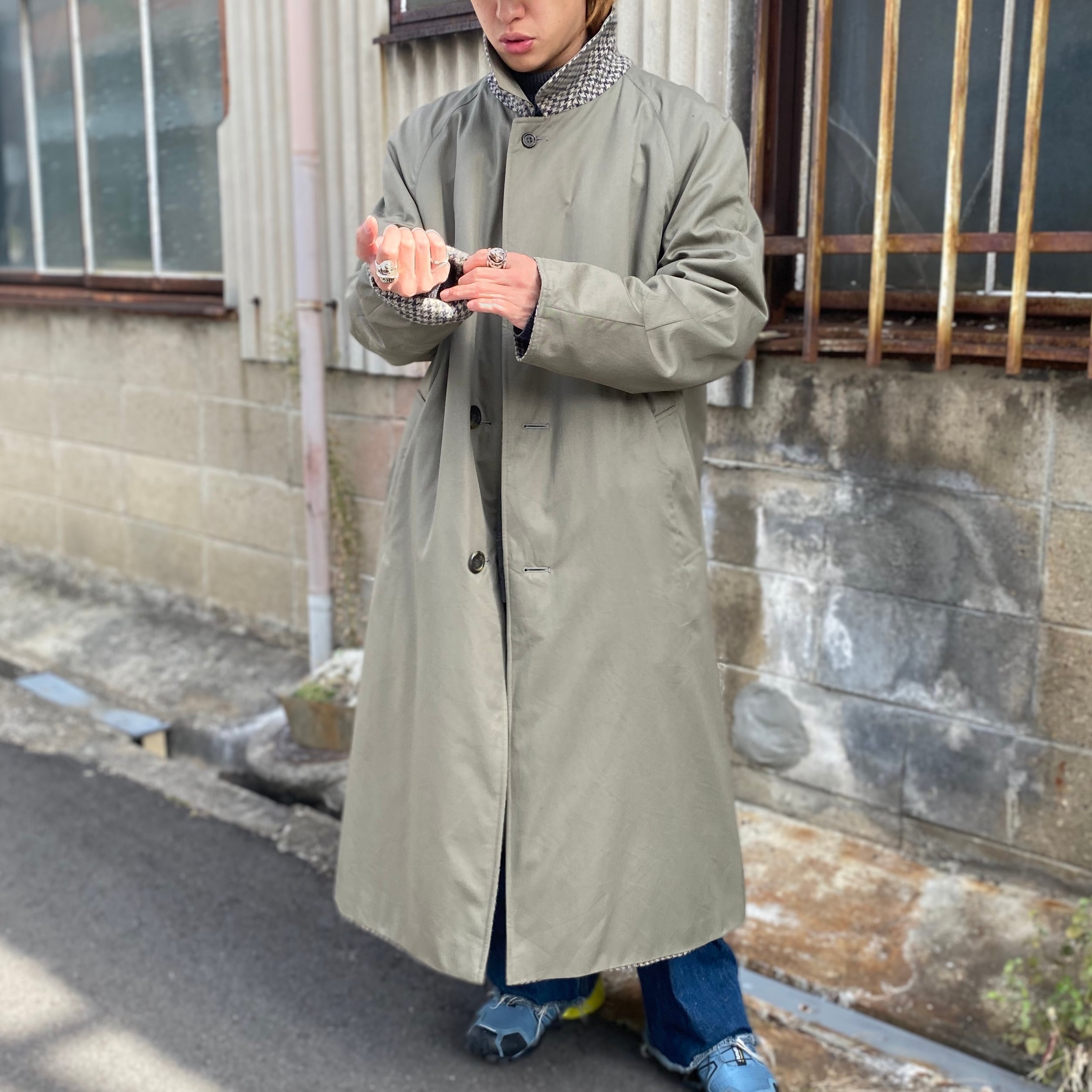 80年代 ビンテージ 英国製 Aquascutum アクアスキュータム リバーシブル ステンカラーコート バルマカーンコート マキシコート カーキグレー 千鳥格子 チェック柄 ウール 80s ヴィンテージ メンズXL相当 古着 【コート】