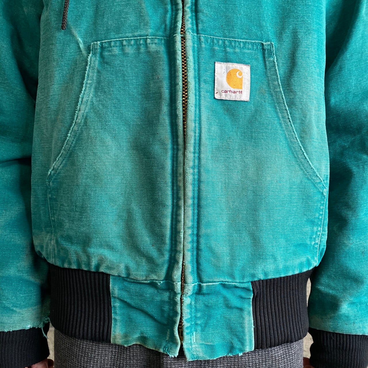■80~90年代 Carhartt カーハート アクティブジャケット メンズM 古着 ダック地 ワークジャケット アクティブパーカー キルティングライナー フルジップパーカー グリーン 緑色 ヴィンテージ 80s~90s【ワークジャケット】