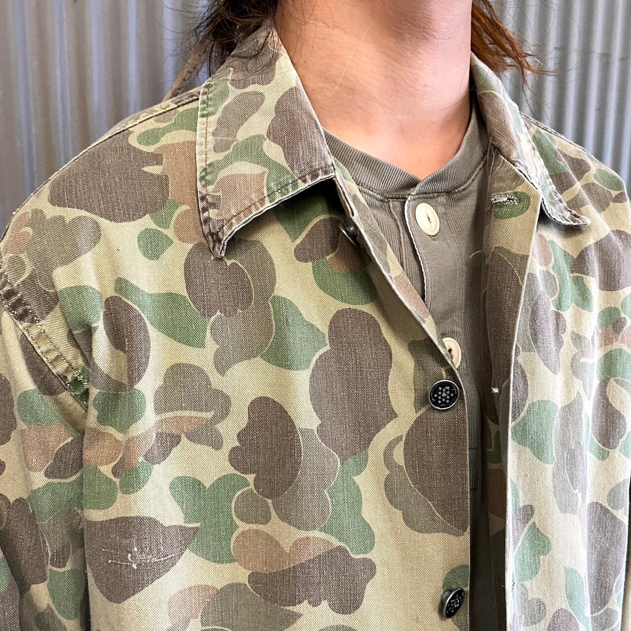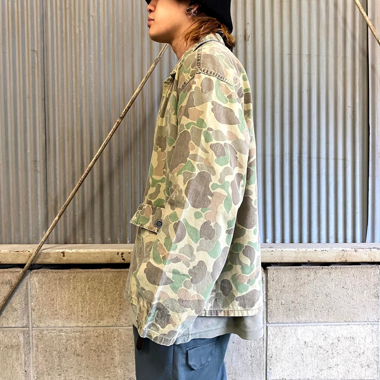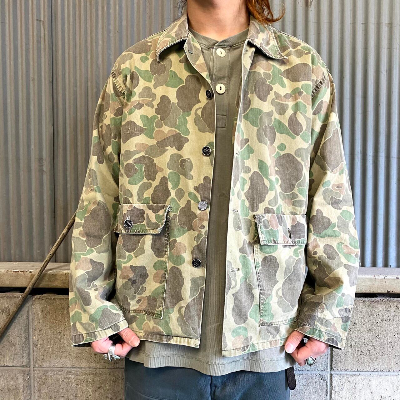 60年代 民間品 ダックハンターカモ ミリタリーシャツ メンズL相当 カーキ 古着 迷彩柄 フロッグスキン ユーティリティシャツ 13スターボタン 13星ボタン 60s ヴィンテージ ビンテージ【長袖シャツ】