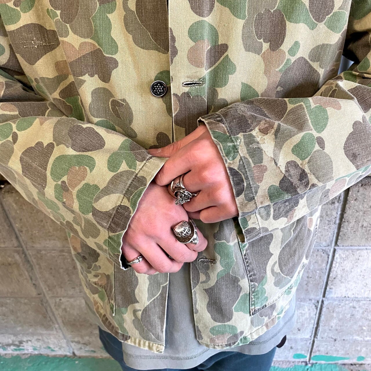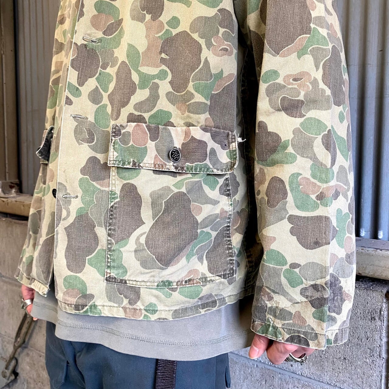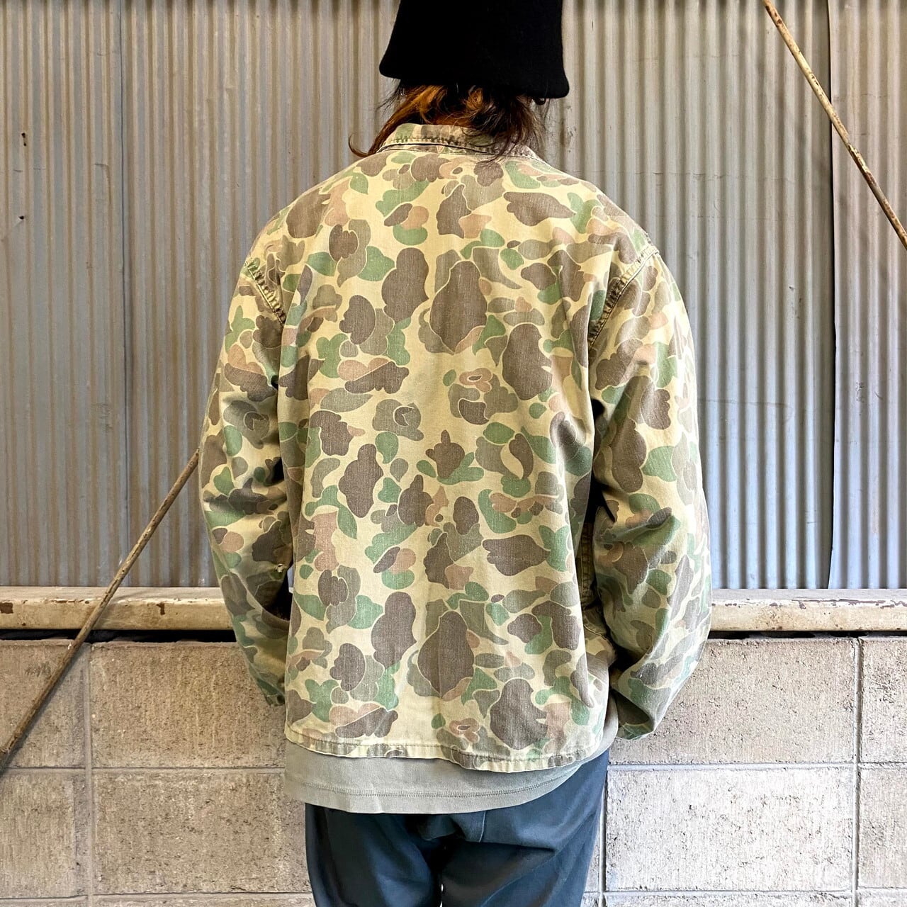 60年代 民間品 ダックハンターカモ ミリタリーシャツ メンズL相当 カーキ 古着 迷彩柄 フロッグスキン ユーティリティシャツ 13スターボタン 13星ボタン 60s ヴィンテージ ビンテージ【長袖シャツ】