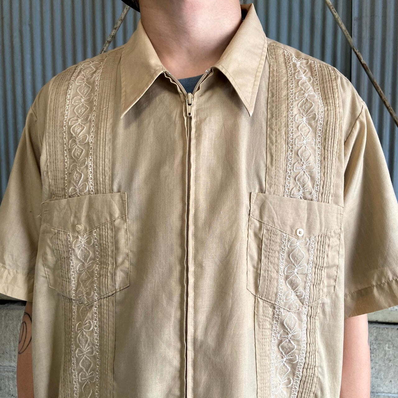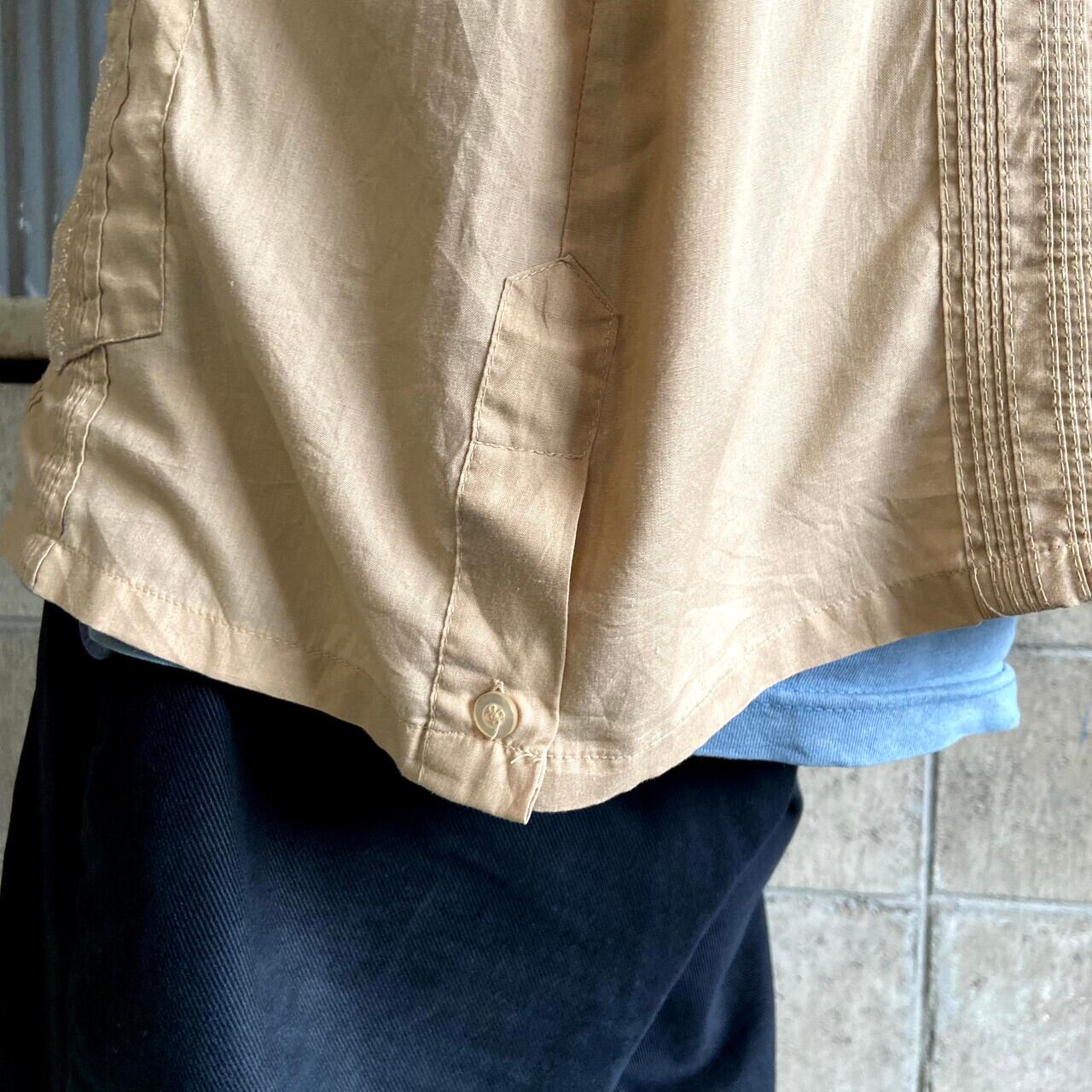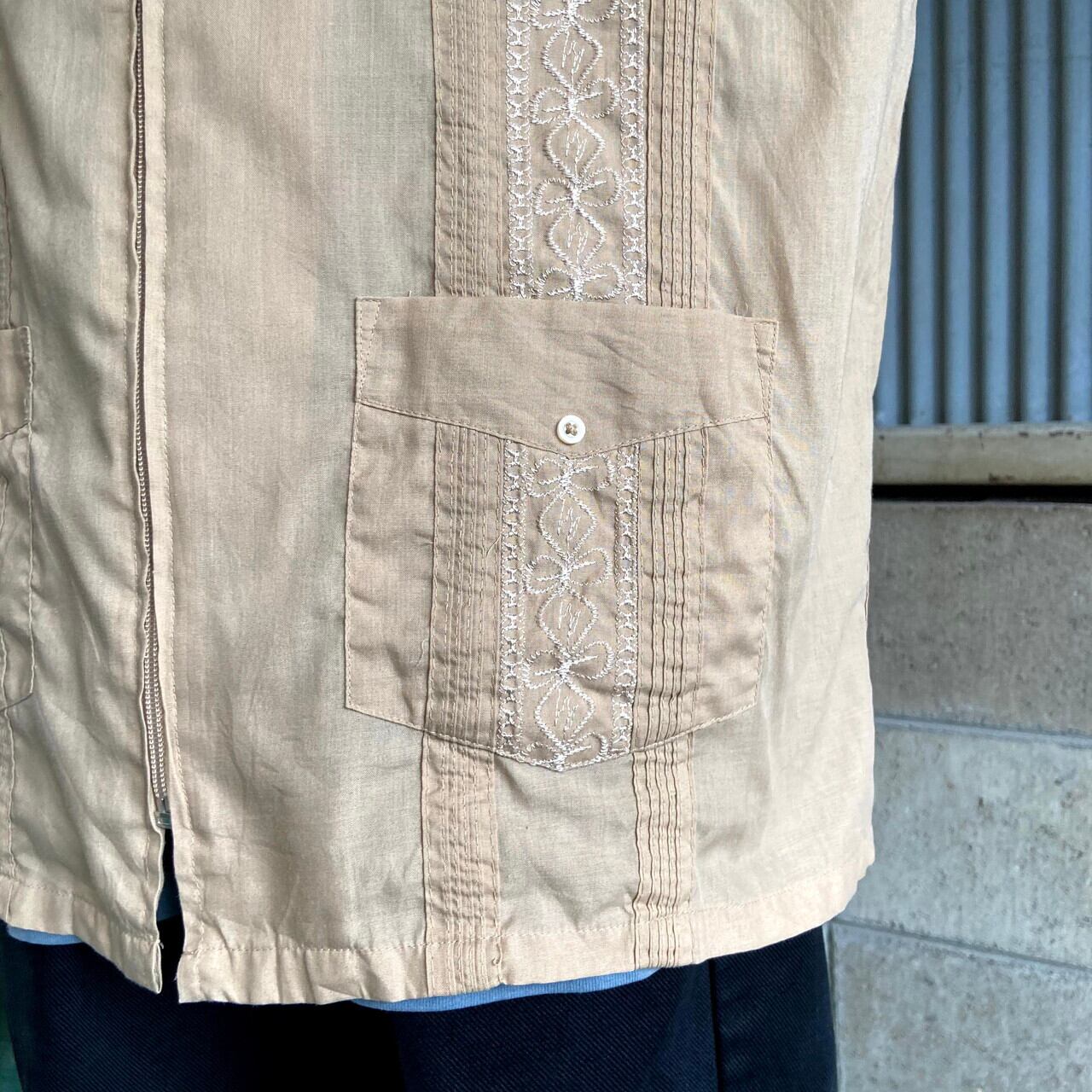 HABAND GUAYABERA フルジップ 半袖 キューバシャツ メンズL相当 古着 メキシカンシャツ 開襟 オープンカラー ライトブラウン 茶色【半袖シャツ】【SA2204】【SS2207】