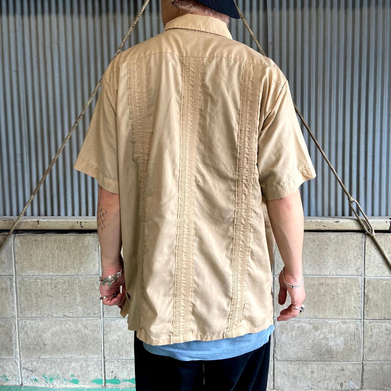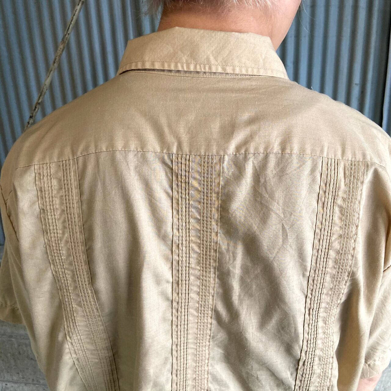 ■HABAND GUAYABERA フルジップ 半袖 キューバシャツ メンズL相当 古着 メキシカンシャツ 開襟 オープンカラー ライトブラウン 茶色【半袖シャツ】
