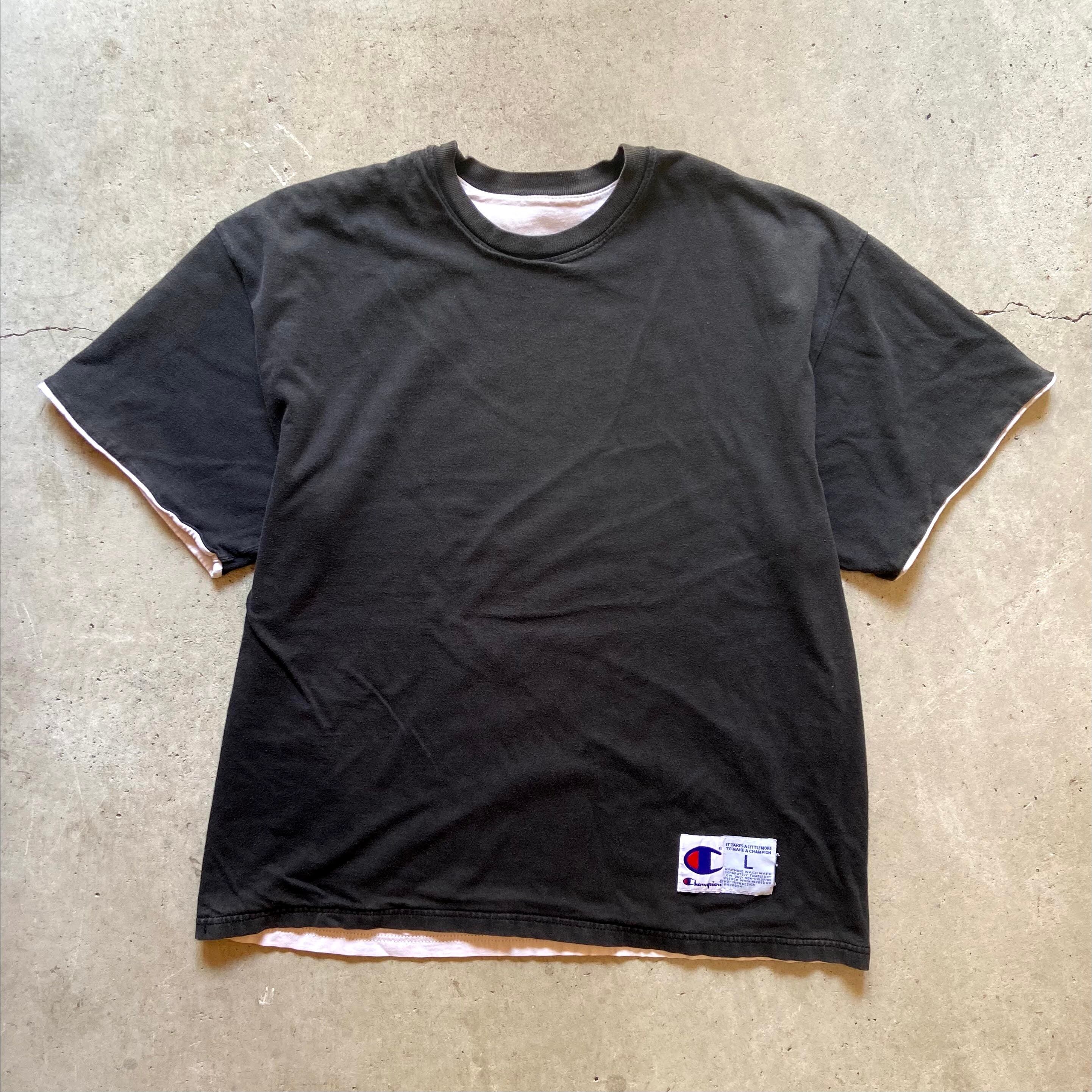 Champion チャンピオン リバーシブル ワンポイントロゴTシャツ メンズL 古着 フェードブラック×ホワイト 墨黒 白【Tシャツ】