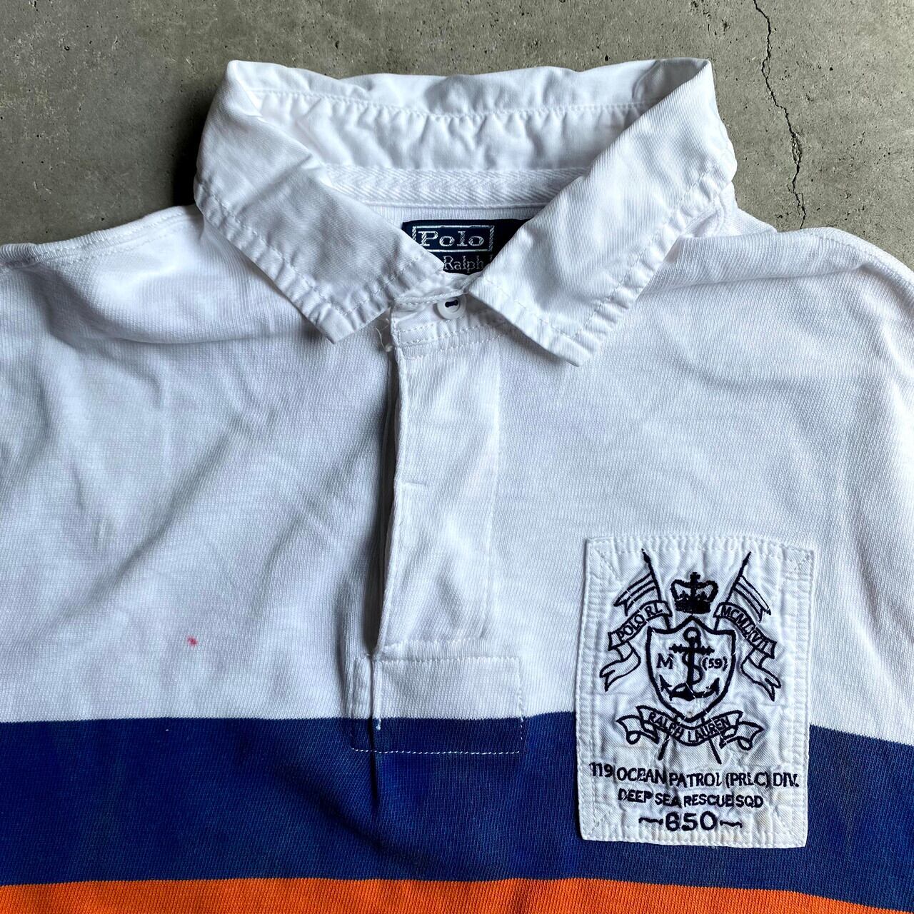 Polo by Ralph Lauren ポロバイラルフローレン ブリーチ ボーダー柄 半袖 ラガーシャツ メンズXL 古着 ポロシャツ ワッペン ホワイト 白 【ポロシャツ・ラガーシャツ】