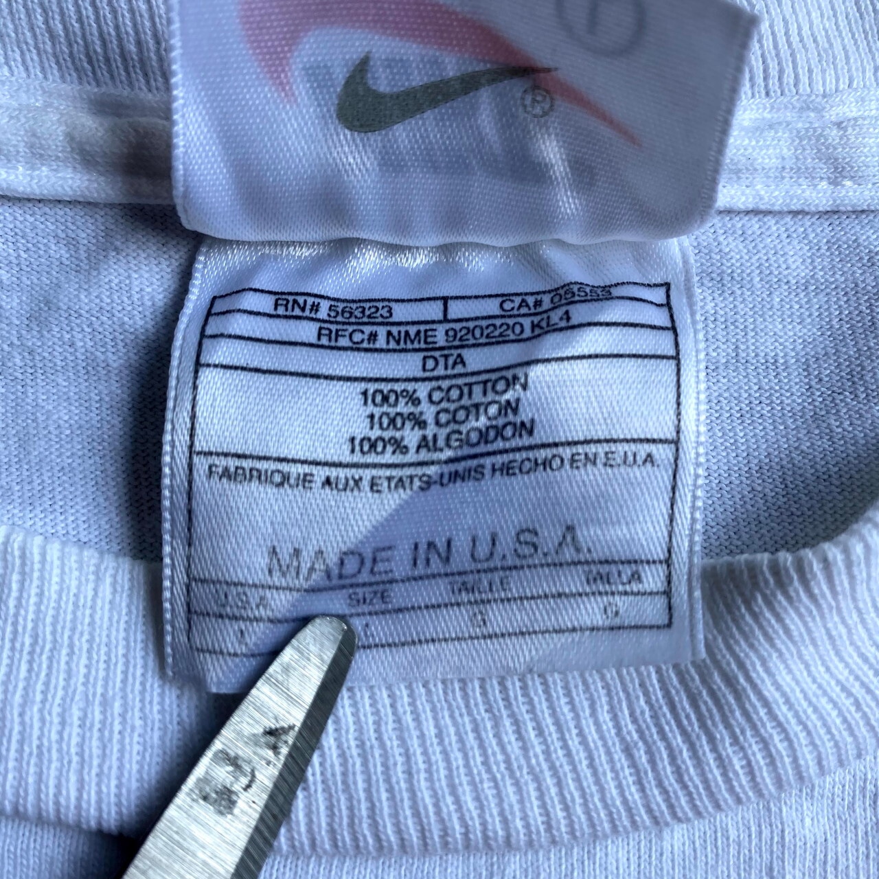 90年代 USA製 NIKE ナイキ CAPITAL CHALLENGE ビッグスウォッシュロゴ 両面プリントTシャツ メンズL 古着 90s ヴィンテージ ビンテージ バックプリント ホワイト 白 【Tシャツ】