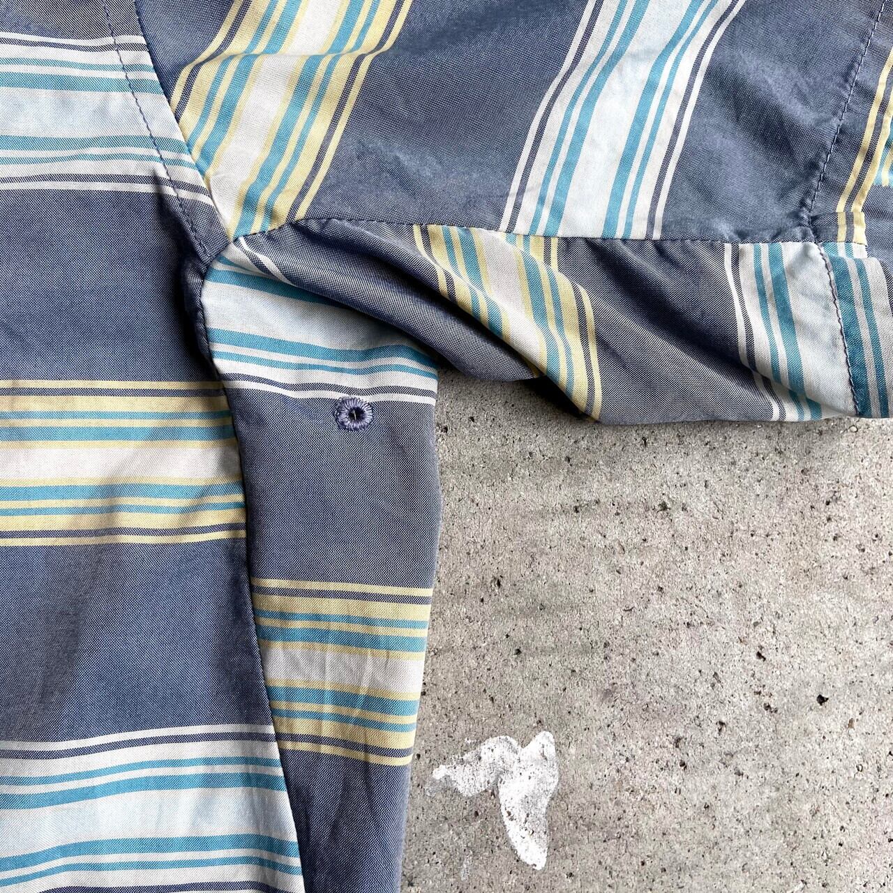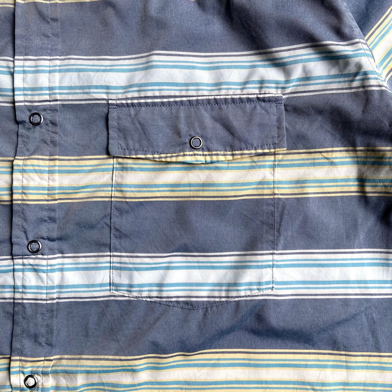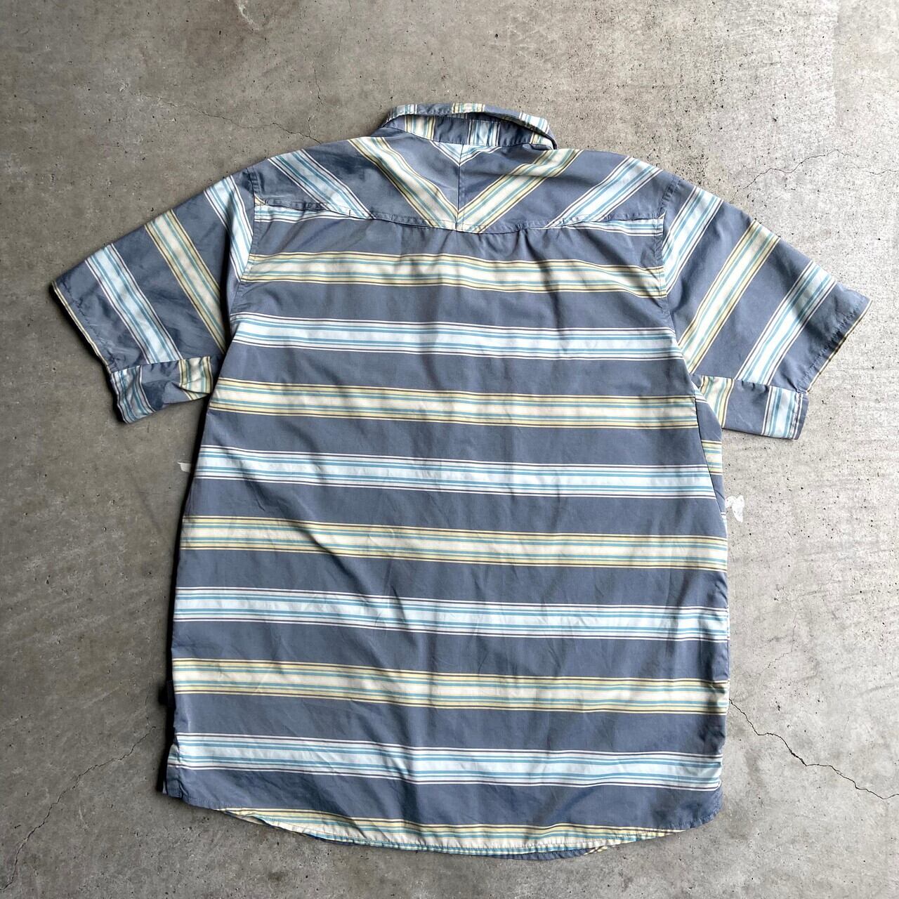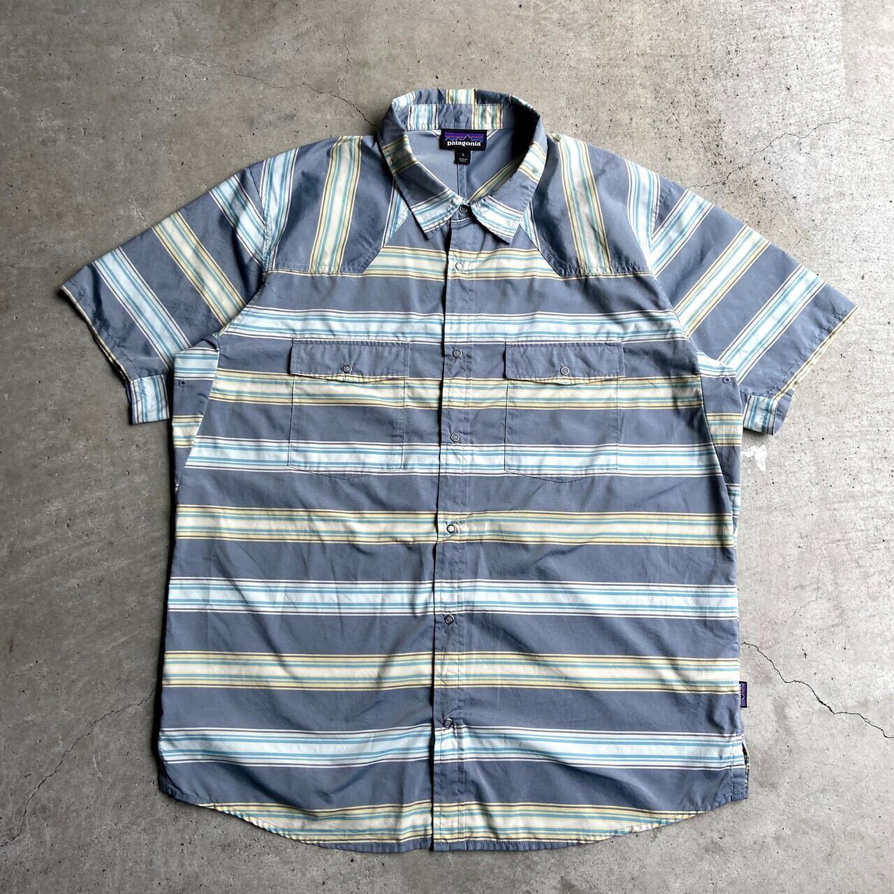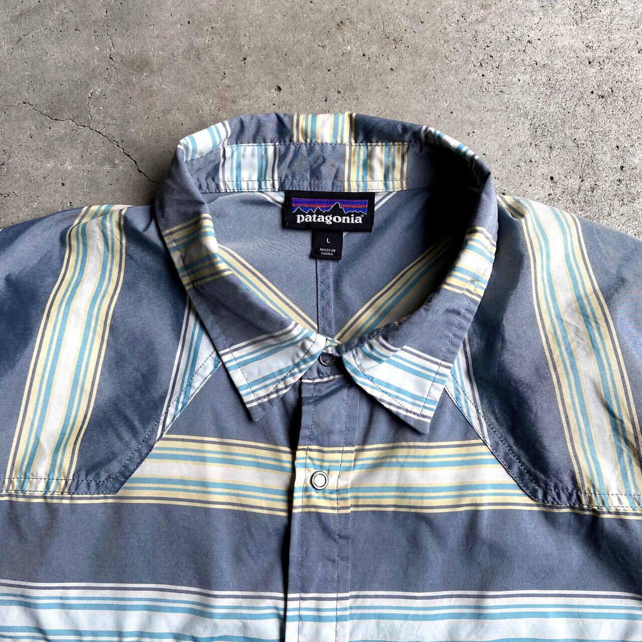 patagonia パタゴニア ポリエステル ボーダー柄 半袖 ウエスタンシャツ メンズL 古着 アウトドアシャツ チャコールグレー【半袖シャツ】