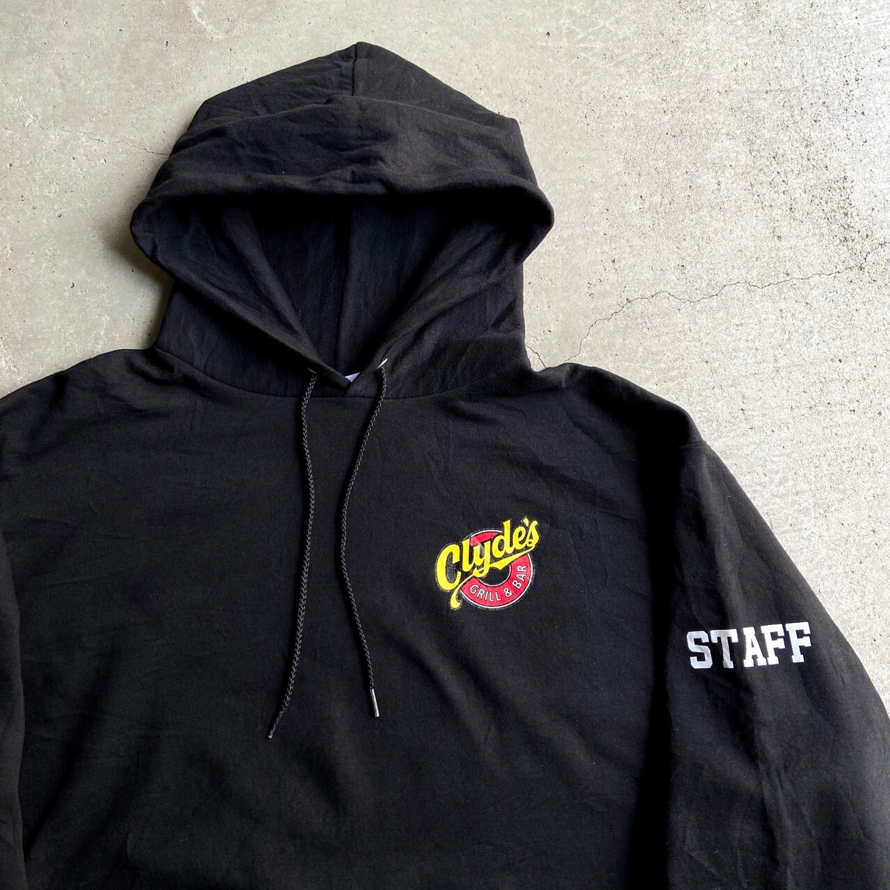 Champion チャンピオン Clyde's ショップロゴ プリント プルオーバーパーカー メンズL 古着 スウェットパーカー 胸ロゴ バックプリント ブラック 黒 【パーカー】