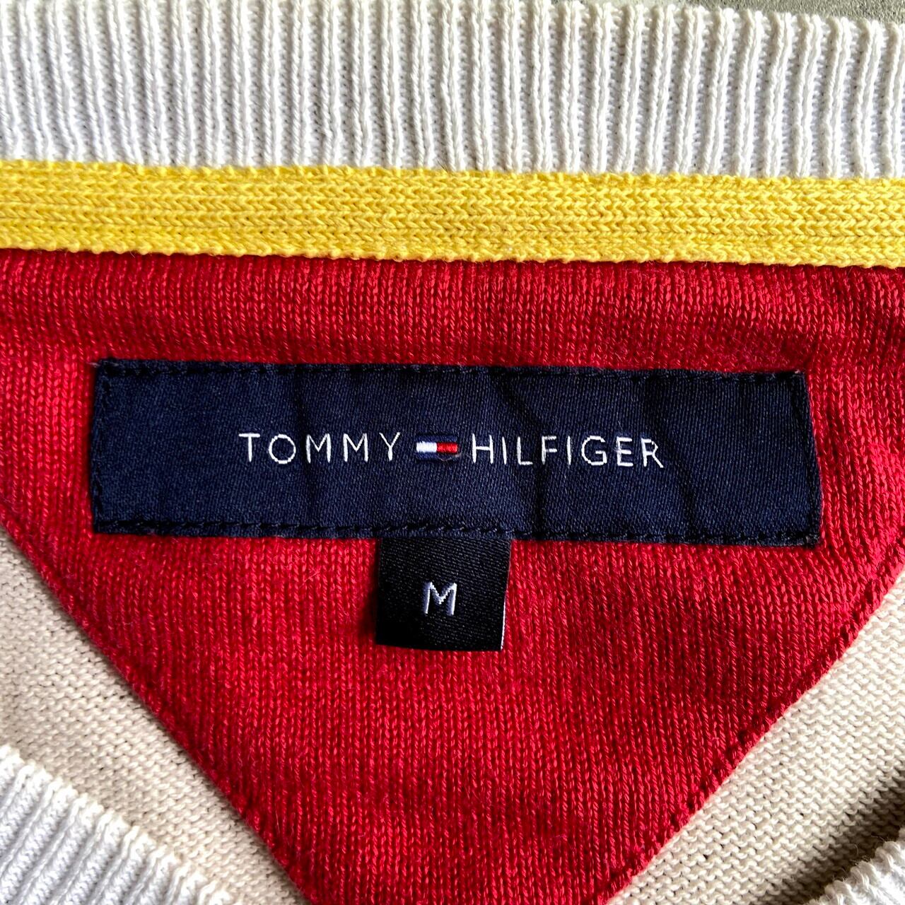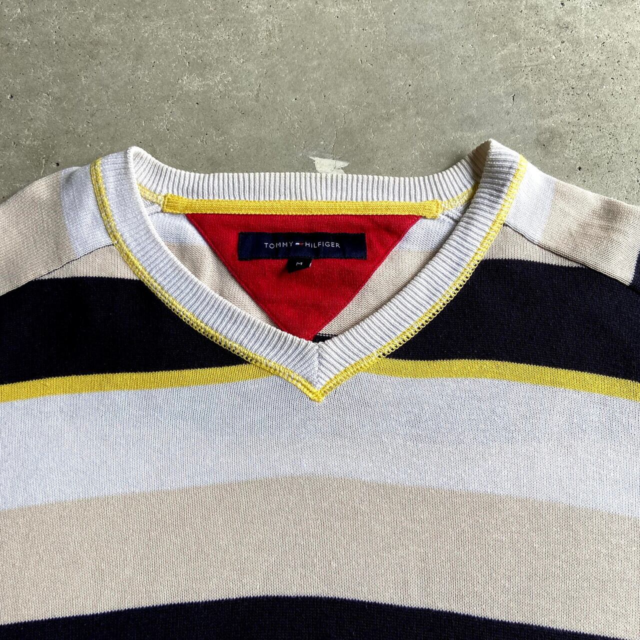 ■TOMMY HILFIGER トミーヒルフィガー ボーダー Vネック コットンニットセーター メンズM 古着 ホワイト ベージュ ネイビー 薄手【ニットセーター】