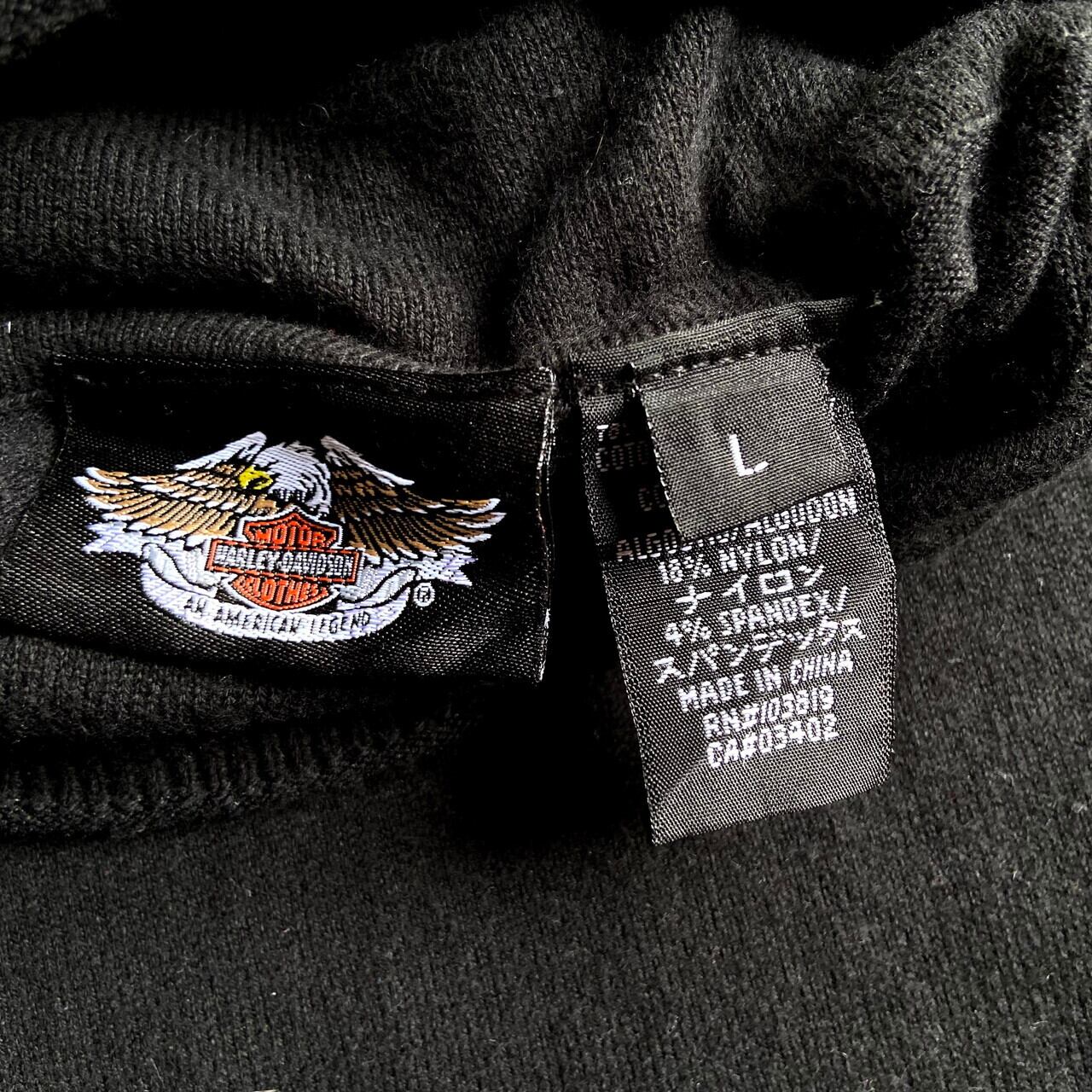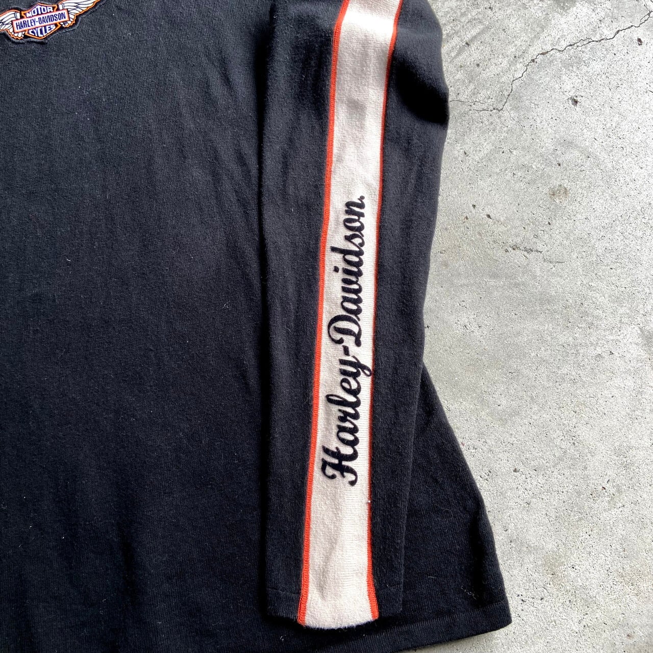 ■Harley-Davidson ハーレーダビッドソン バイク モーターサイクル ロゴワッペン 袖プリント フロッキープリント タートルネックニット レディースL 古着 袖ライン ハイネック コットンニットセーター ブラック 黒 【ニット・セーター】