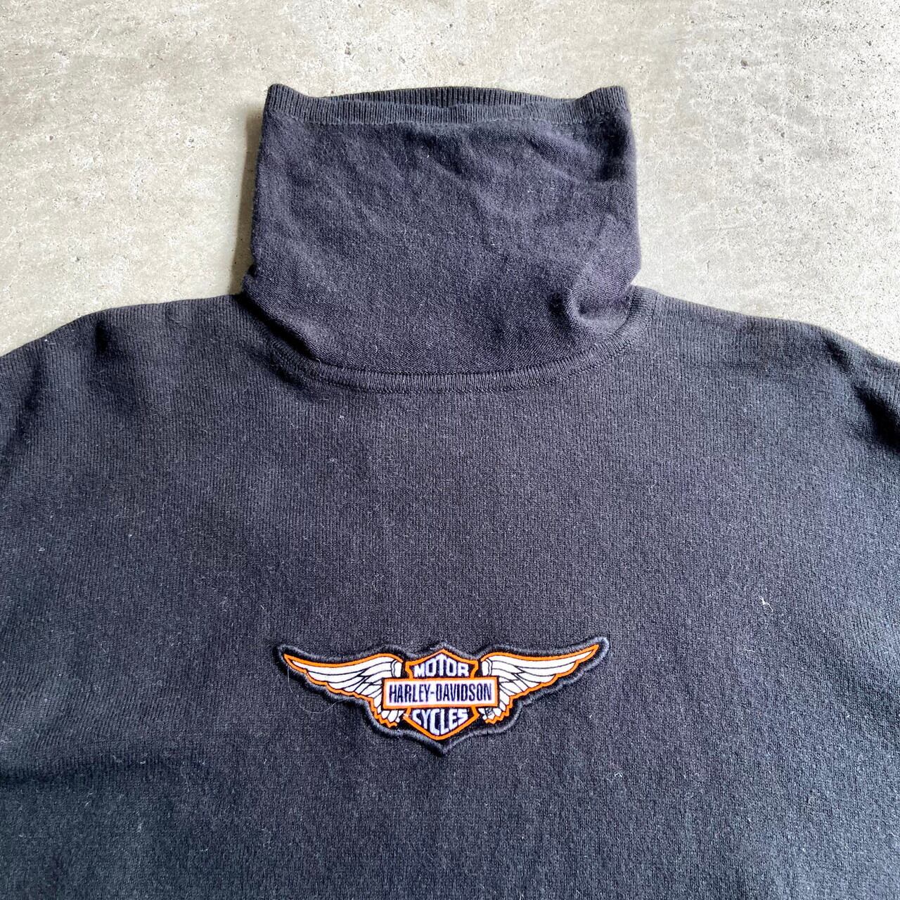 Harley-Davidson ハーレーダビッドソン バイク モーターサイクル ロゴワッペン 袖プリント フロッキープリント タートルネックニット レディースL 古着 袖ライン ハイネック コットンニットセーター ブラック 黒 【ニット・セーター】