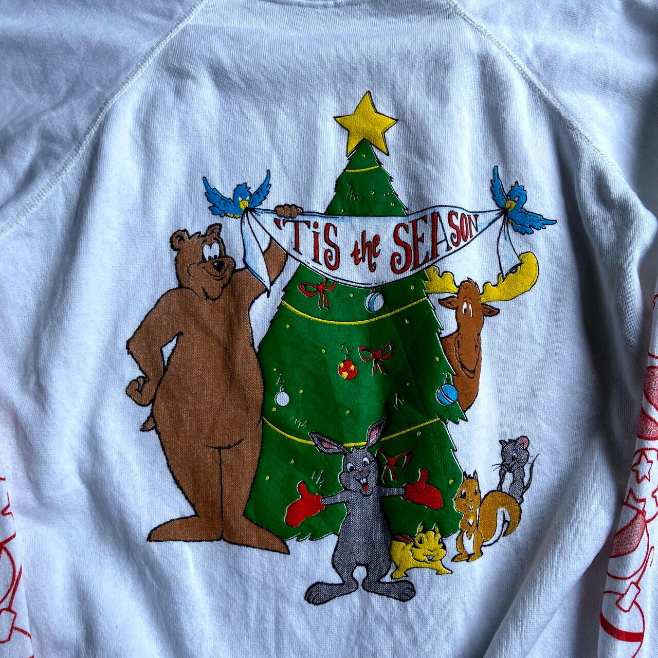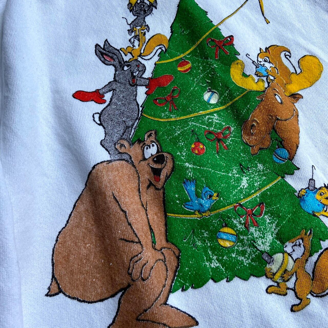 ■90年代 USA製 クリスマス アニマル キャラクター バックプリント 袖プリント スウェット メンズL 古着 レディース 両面プリント 90s ヴィンテージ ビンテージ トレーナー Hanes ヘインズ ホワイト【スウェット】