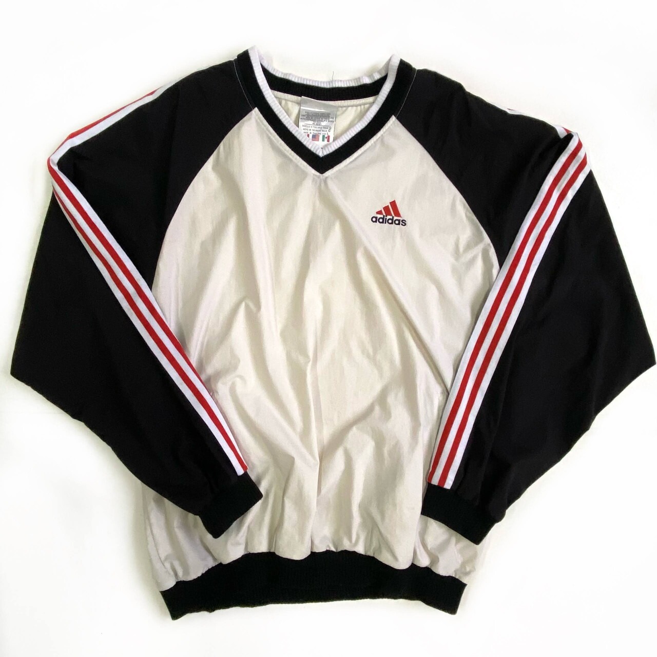90年代 adidas アディダス ワンポイント ロゴ刺繍 Vネック ウォームアッププルオーバー メンズL 古着 90S ビンテージ ヴィンテージ ナイロンジャケット ホワイト 白色【ナイロンジャケット】