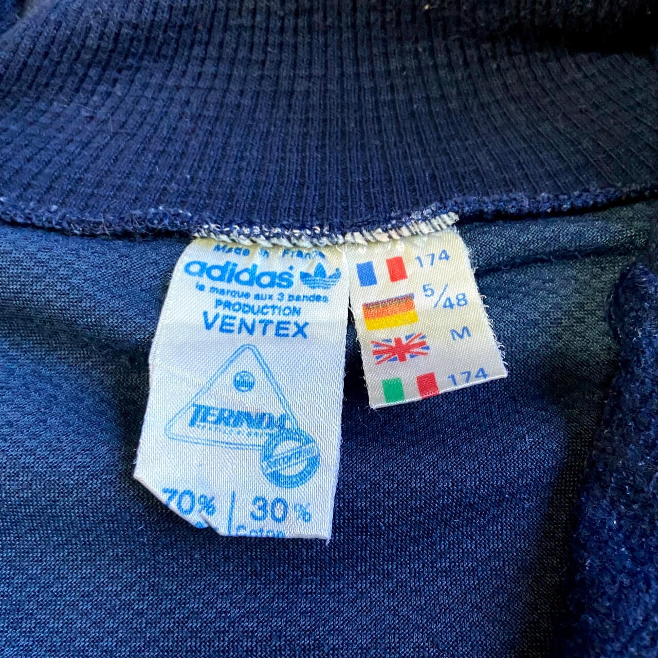 80年代 フランス製 adidas アディダス ベロアジャージ トラックジャケット 古着 メンズMサイズ相当 切替 VENTEX社 ネイビー×グレー×ホワイト 紺 白【ジャージ・トラックジャケット】