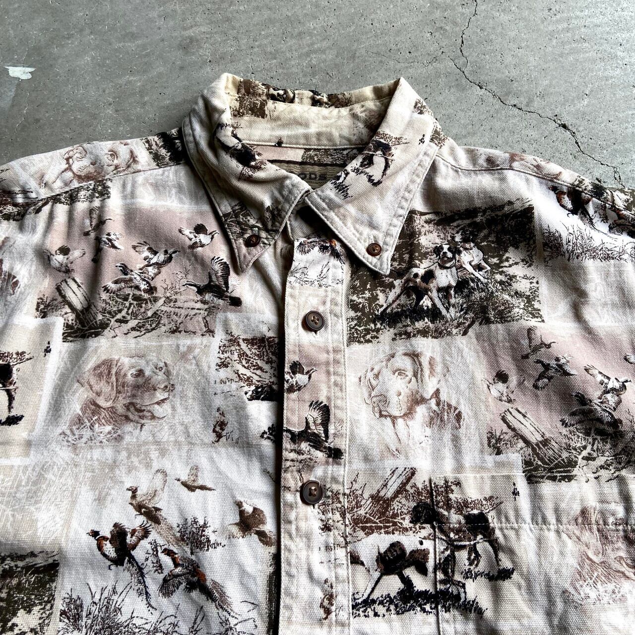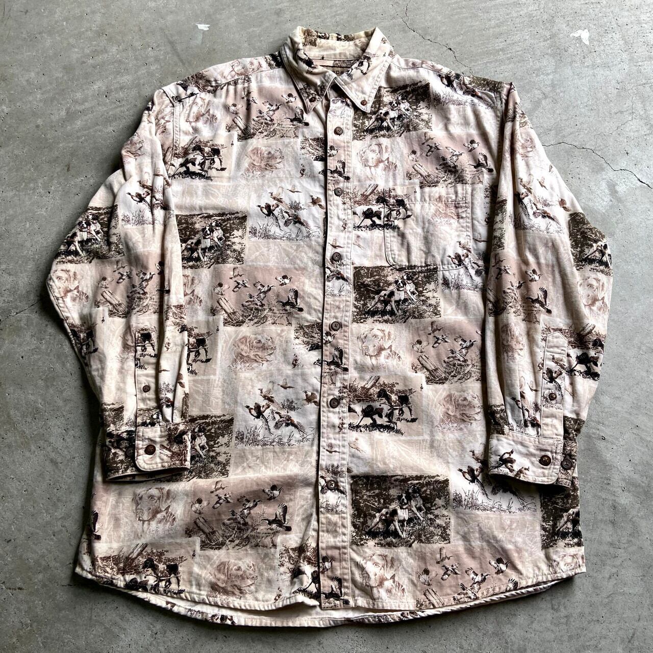 WOODS WATER 犬 鳥 総柄 長袖コットンシャツ メンズM 古着 ボタンダウン B.D ライトブラウン ベージュ 茶色 アニマル【長袖シャツ】【CS2211-50】