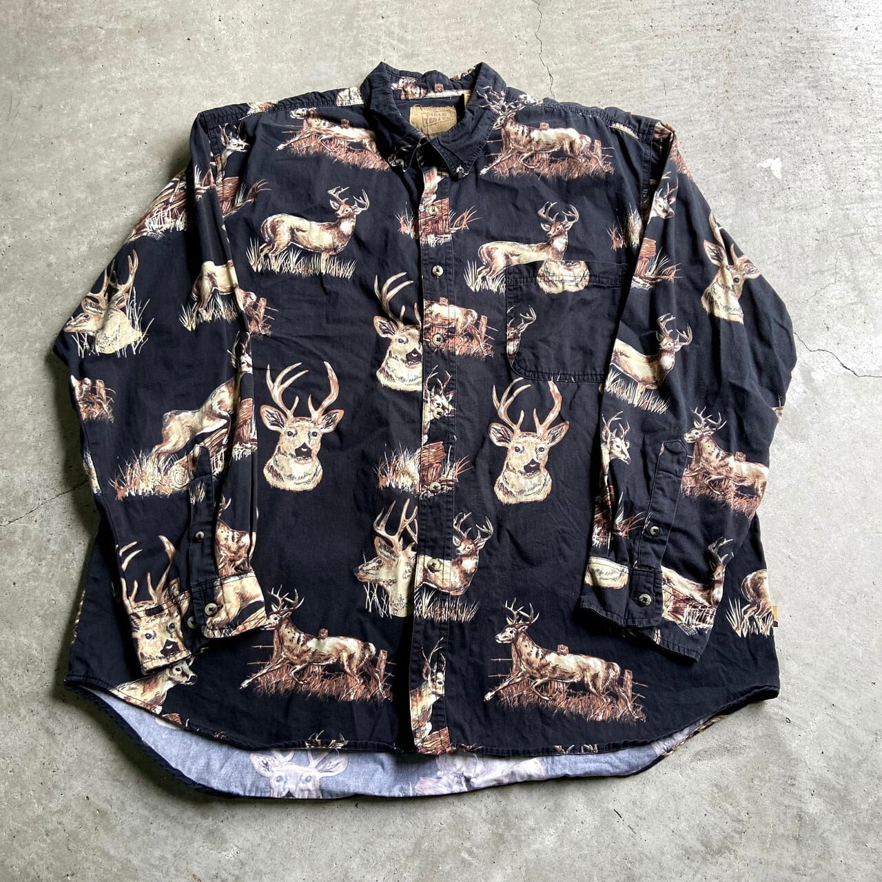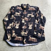 FIELD TESTED 鹿 総柄 長袖コットンシャツ メンズXL 古着 ボタンダウン B.D ブラック 黒色 アニマル【長袖シャツ】【SA211130】