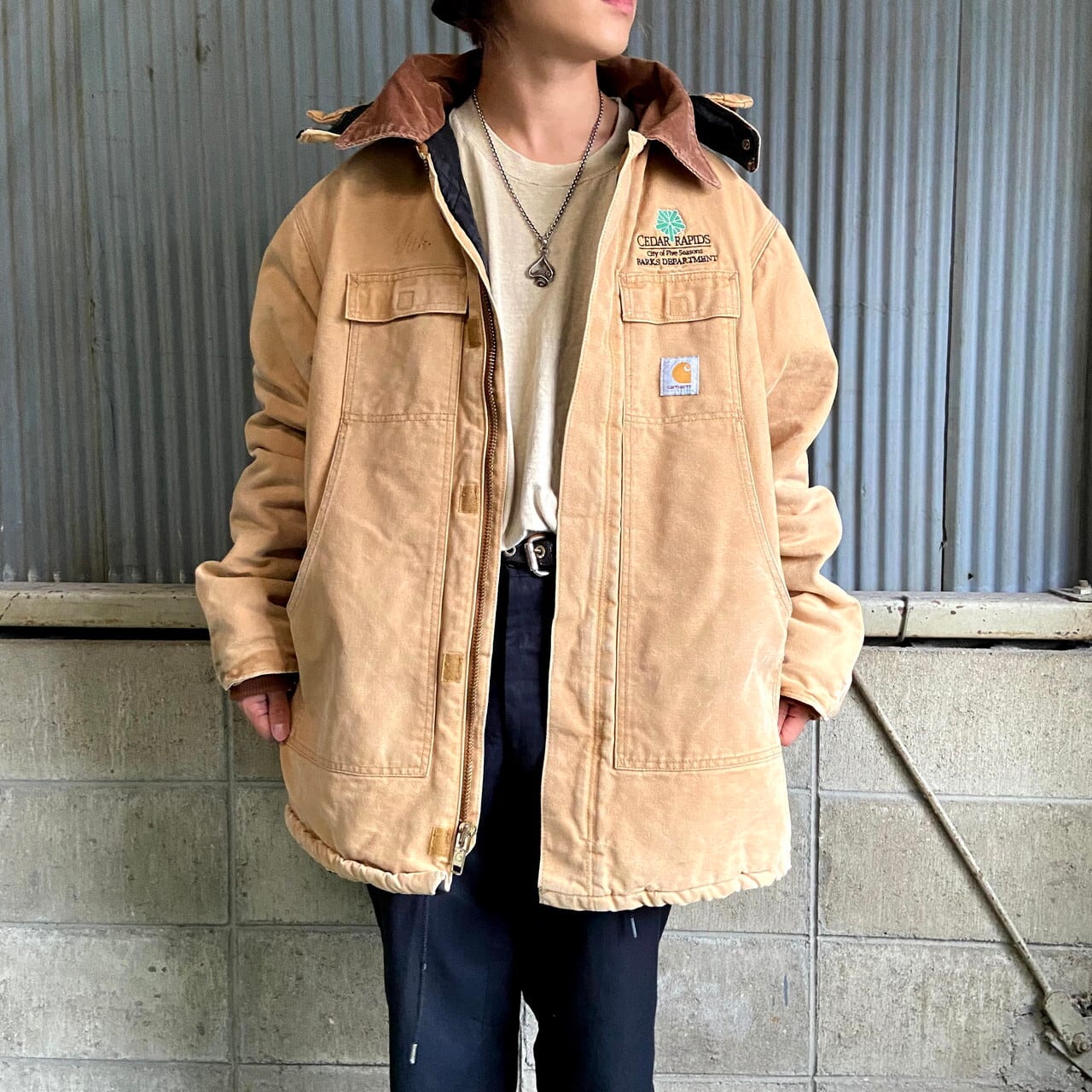 ビッグサイズ カーハート トラディショナルジャケット ワークジャケット 企業ロゴ 刺繍 メンズ2XL相当 古着 Carhartt 別売りフード付き ダック地 カバーオール フリースグライナー キャメル ブラウン 茶色【ワークジャケット】【AL2110】