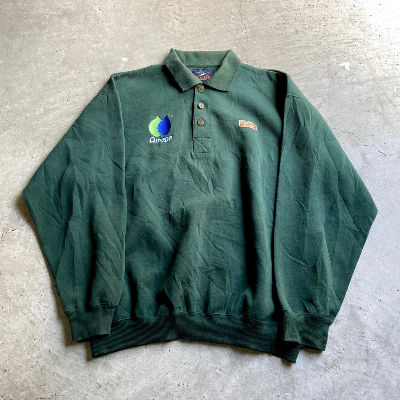 TRACKER ハーフボタン 襟付き ワンポイントロゴ 刺繍 スウェット グリーン 緑色 メンズL 古着 【スウェット】