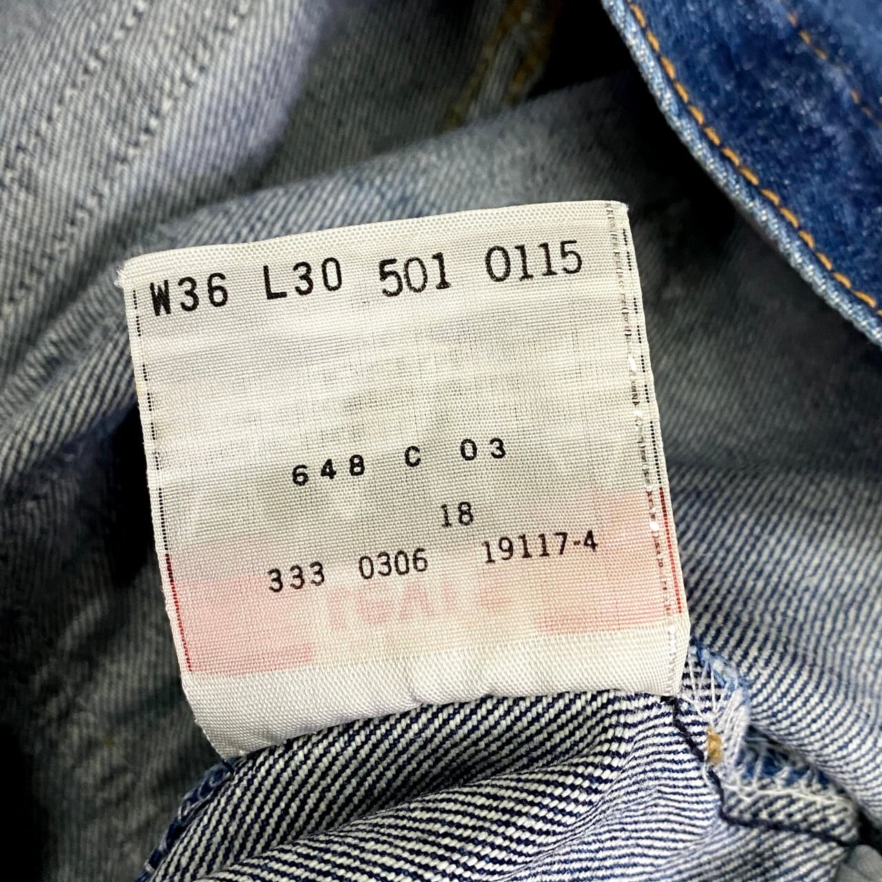 ◎80s以降の生デニム(ワンウォッシュ)のモデルを示す「0115」。ボタン裏 333M
