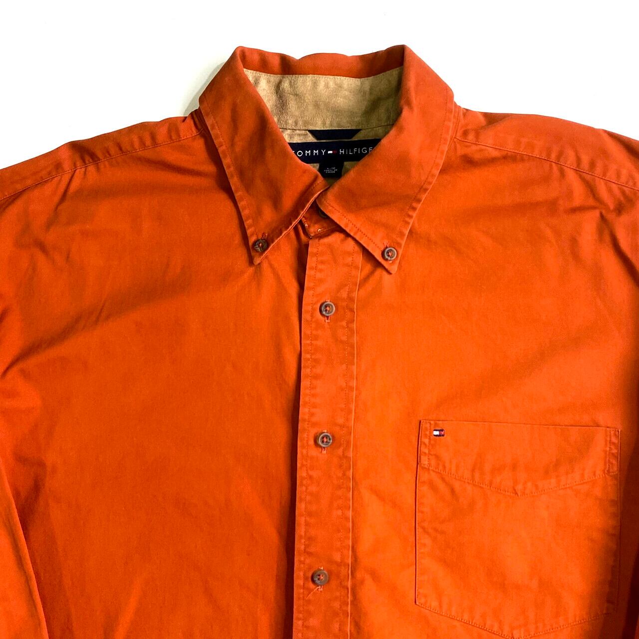 00年代 TOMMY HILFIGER トミーヒルフィガー ワンポイントロゴ刺繍 カラー コットン 長袖シャツ メンズL 古着 ボタンダウン オレンジ 00s ヴィンテージ ビンテージ【長袖シャツ】【SS2201-50】