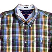 ■TOMMY JEANS トミーヒルフィガー 長袖 チェックシャツ メンズXL 古着 ボタンダウンシャツ グリーン系 緑色【長袖シャツ】