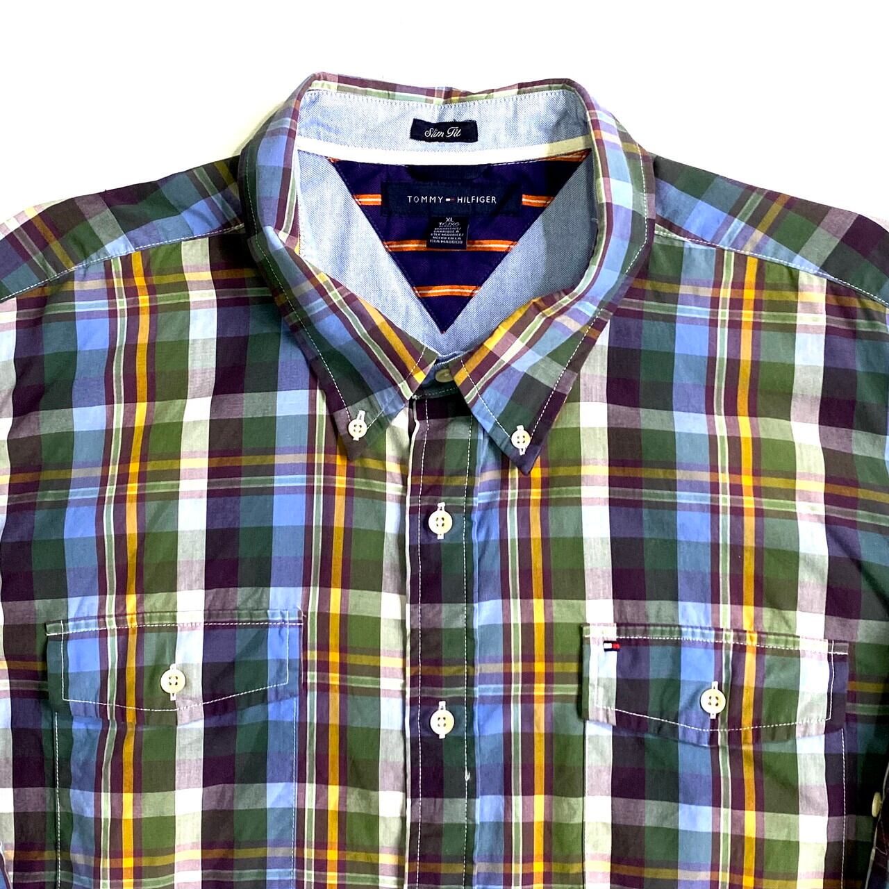 TOMMY JEANS トミーヒルフィガー 長袖 チェックシャツ メンズXL 古着 ボタンダウンシャツ グリーン系 緑色【長袖シャツ】