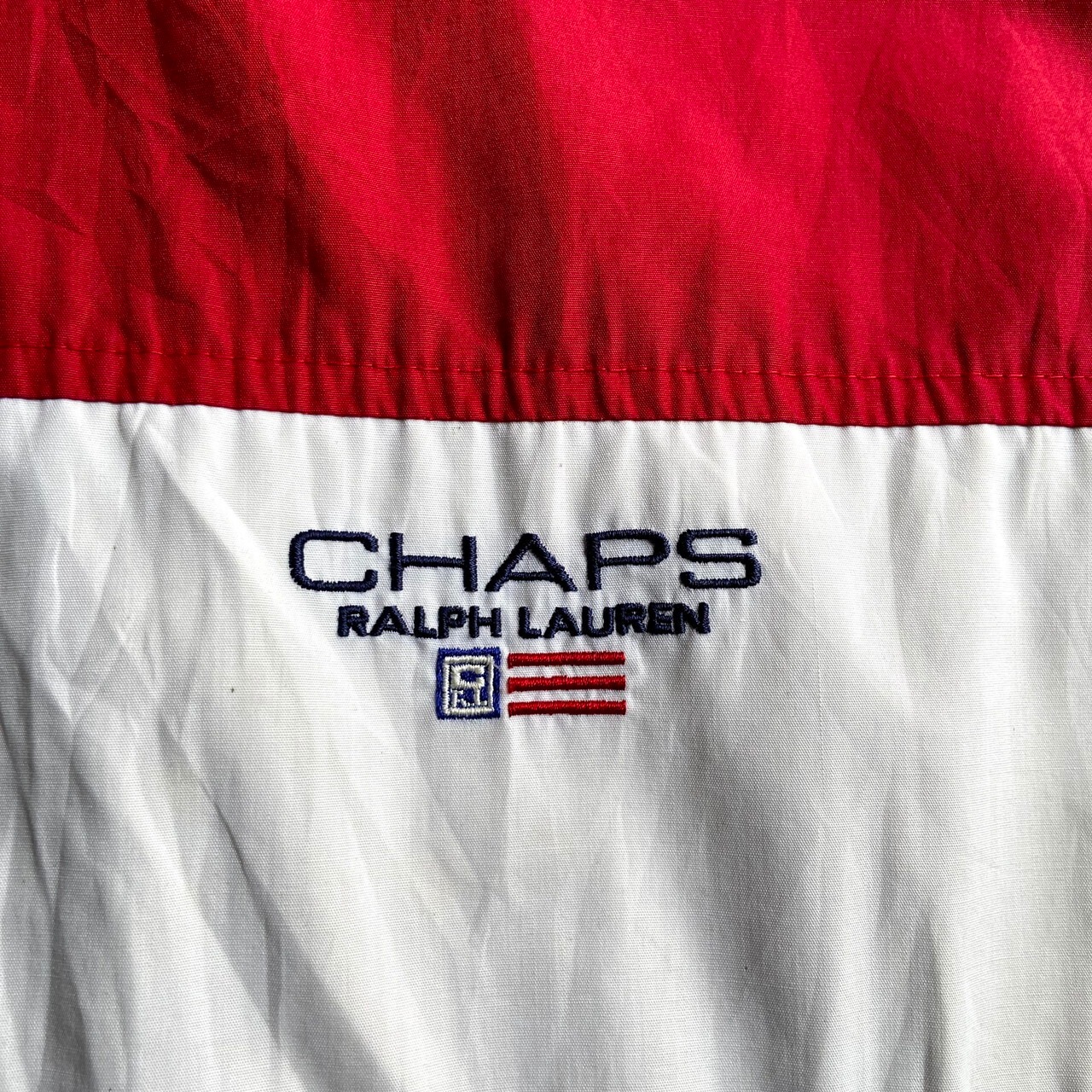 ■90年代 CHAPS Ralph Lauren チャップス ラルフローレン ワンポイントロゴ刺繍 ナイロンジャケット メンズXL相当 古着 切替 フード収納型 90s ヴィンテージ ビンテージ ハイネック レッド×ネイビー×ホワイト 紺 白 赤色 【ナイロンジャケット】