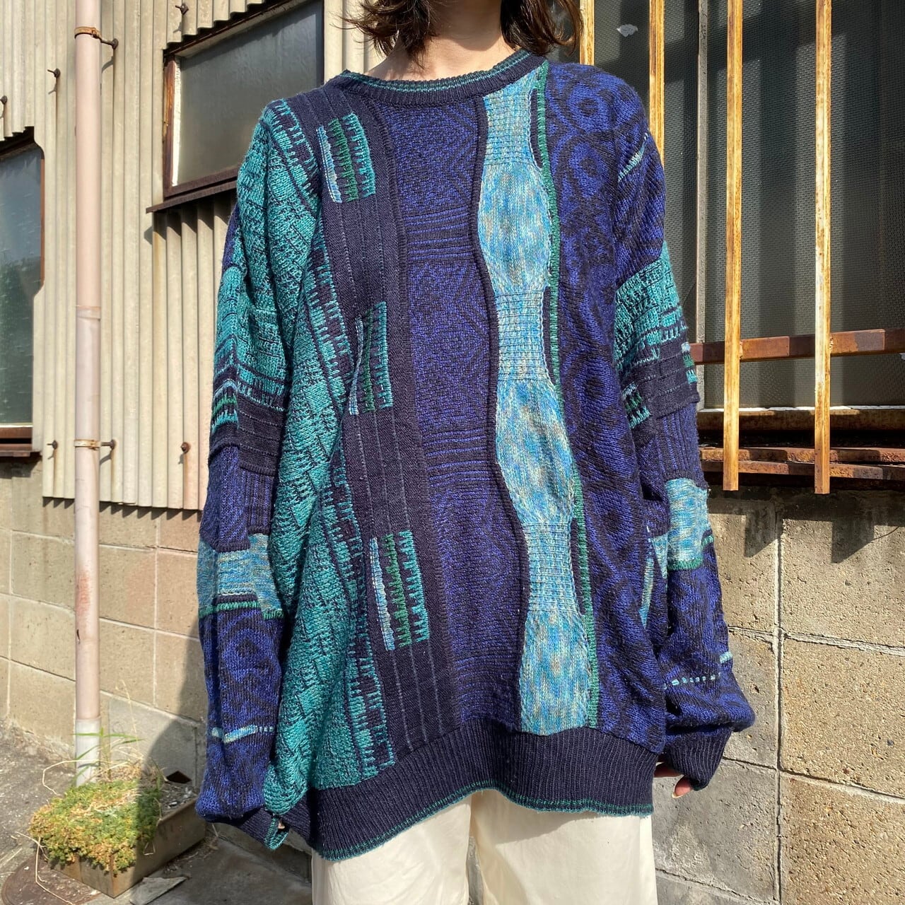 ■LE TIGER クージー風 3Dニット 総柄 アクリル ニットセーター メンズXL 古着 ネイビー×グリーン 紺 緑【ニットセーター】