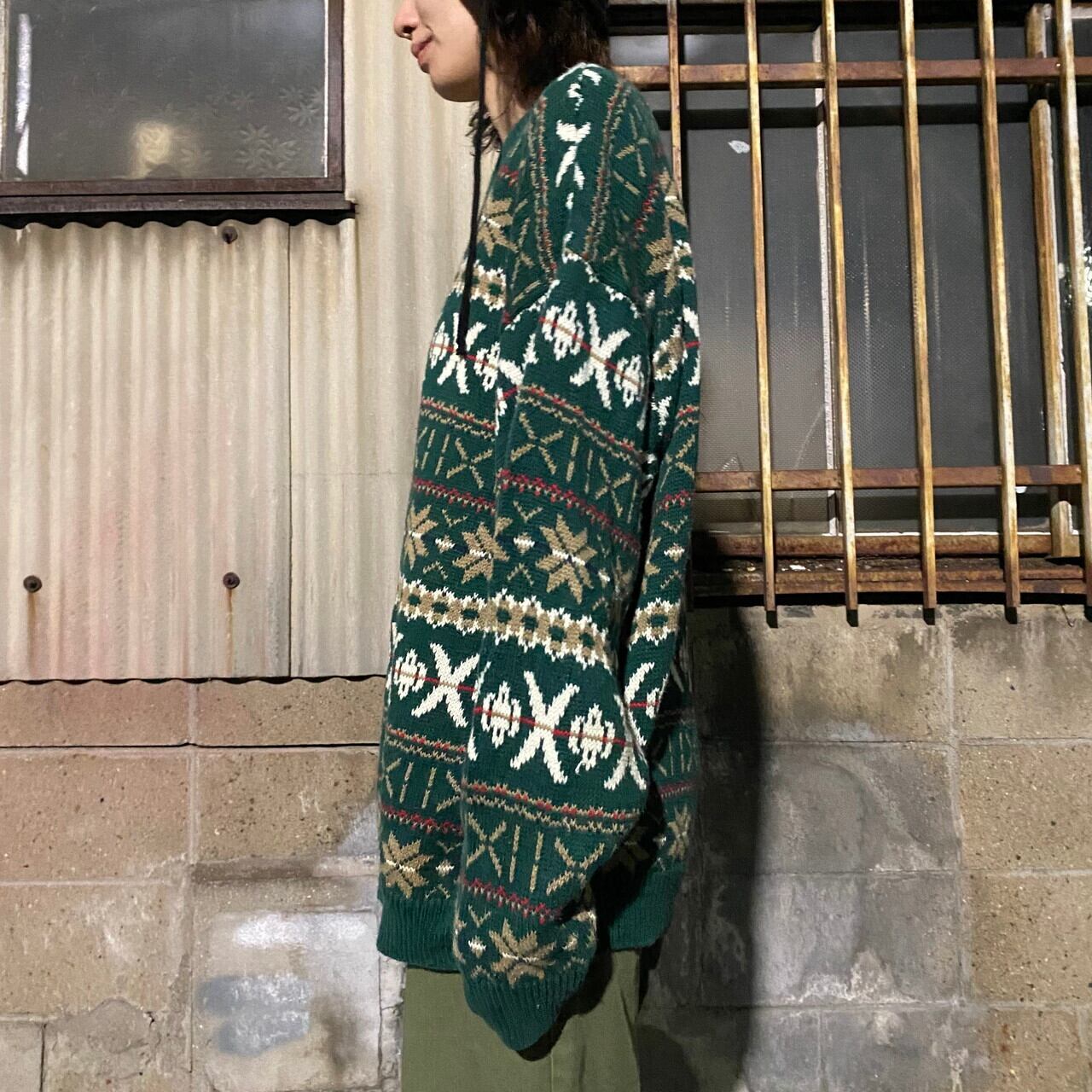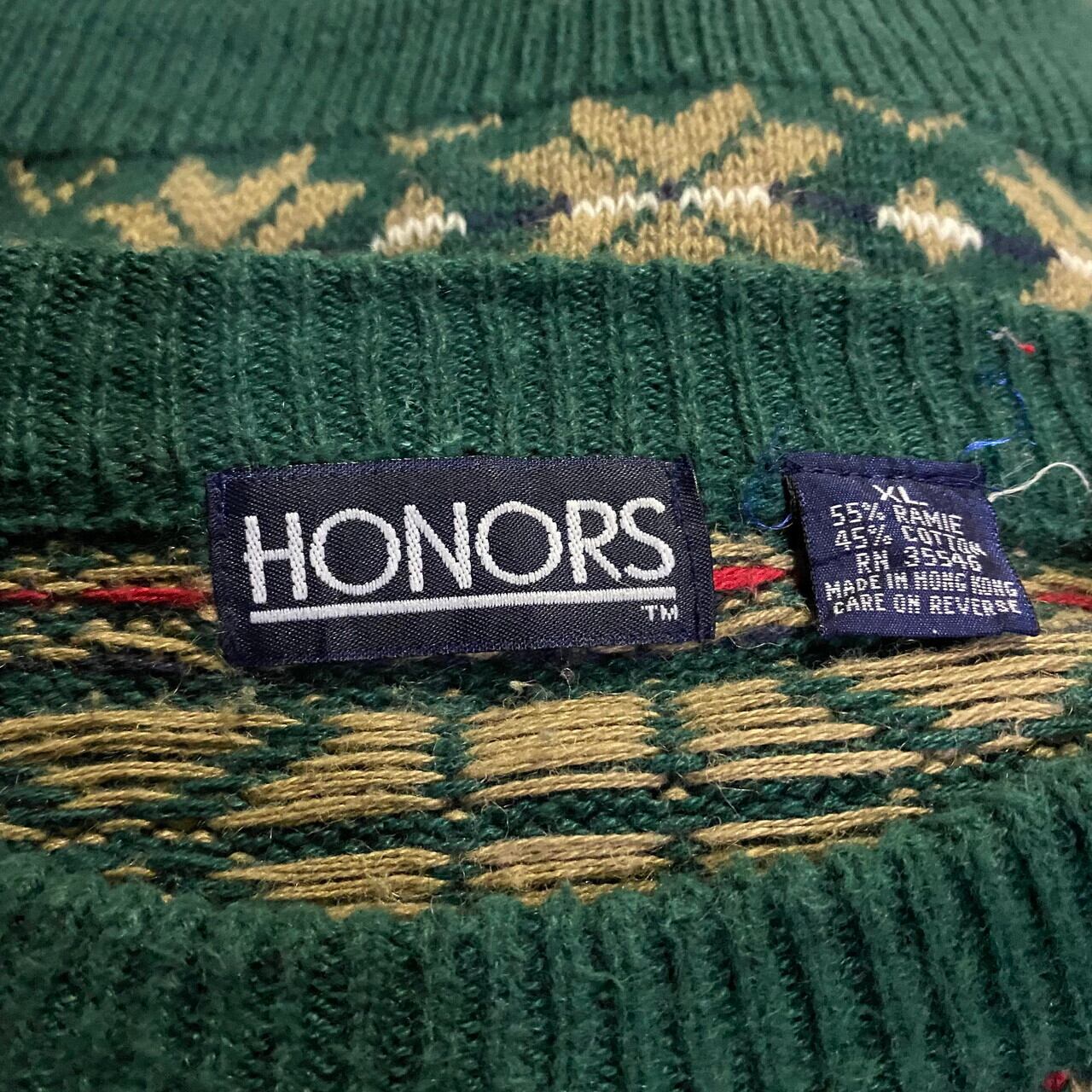 HONORS フェアアイル 総柄 ラミー×コットン ニットセーター メンズXL 古着 グリーン 緑 【ニットセーター】【AL2110】