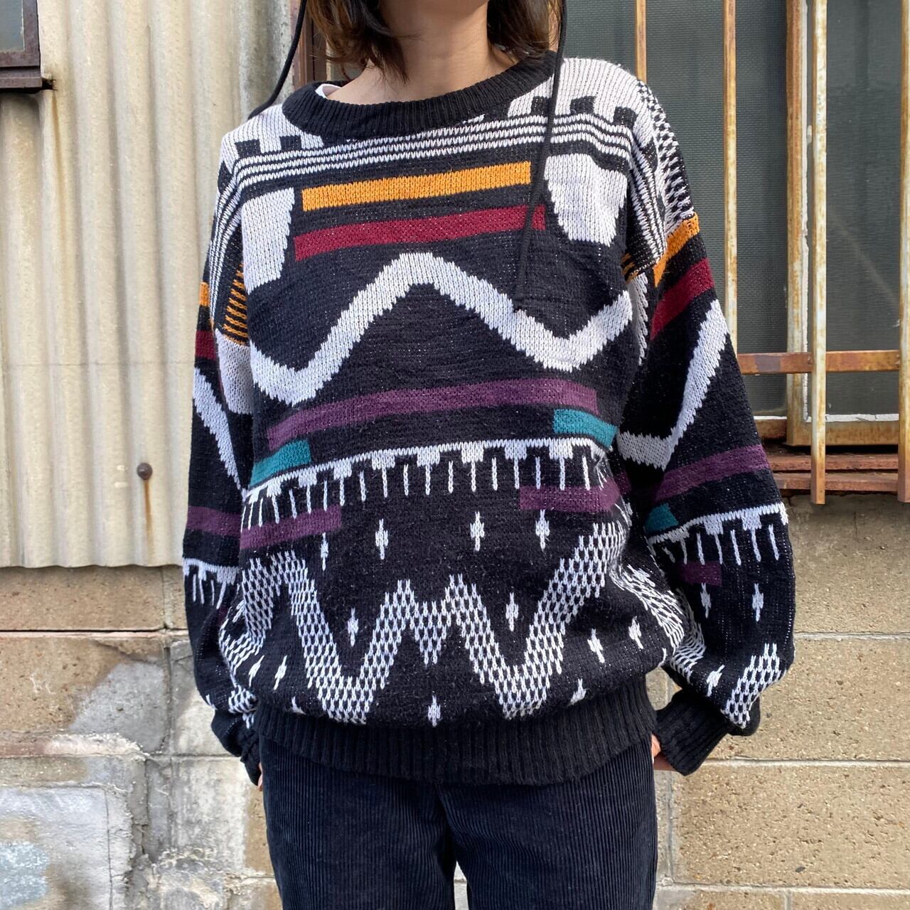 ■WEEDS 総柄 アクリルニットセーター メンズXL相当 古着 ブラック 黒 【ニットセーター】