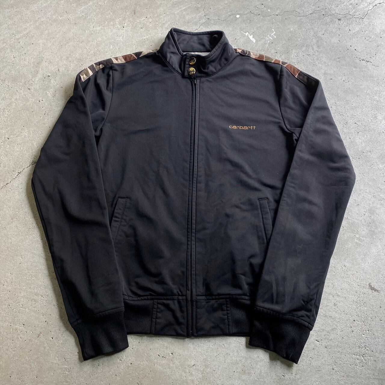 Carhartt カーハート ハイネック ワンポイントロゴ刺繍 迷彩 サイドライン トラックジャケット レディースS相当 古着 ジャージ ブラック 黒色 【ジャージ・トラックジャケット】【WS2201】【CS2209-50】