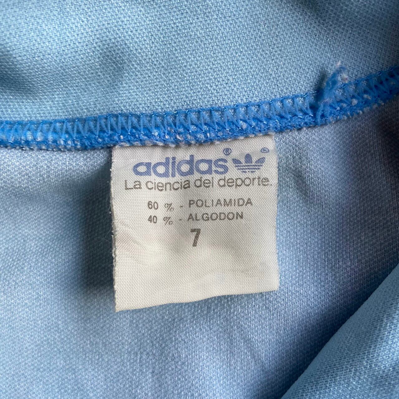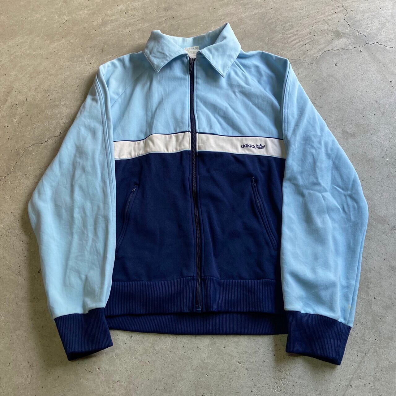 ■80年代 adidas アディダス ユーロ 襟付き バックロゴ ジャージ トラックジャケット メンズM相当 古着 80s ヴィンテージ ビンテージ ワンポイントロゴ フロッキープリント サックスブルー ネイビー 水色 紺色【ジャージ・トラックジャケット】