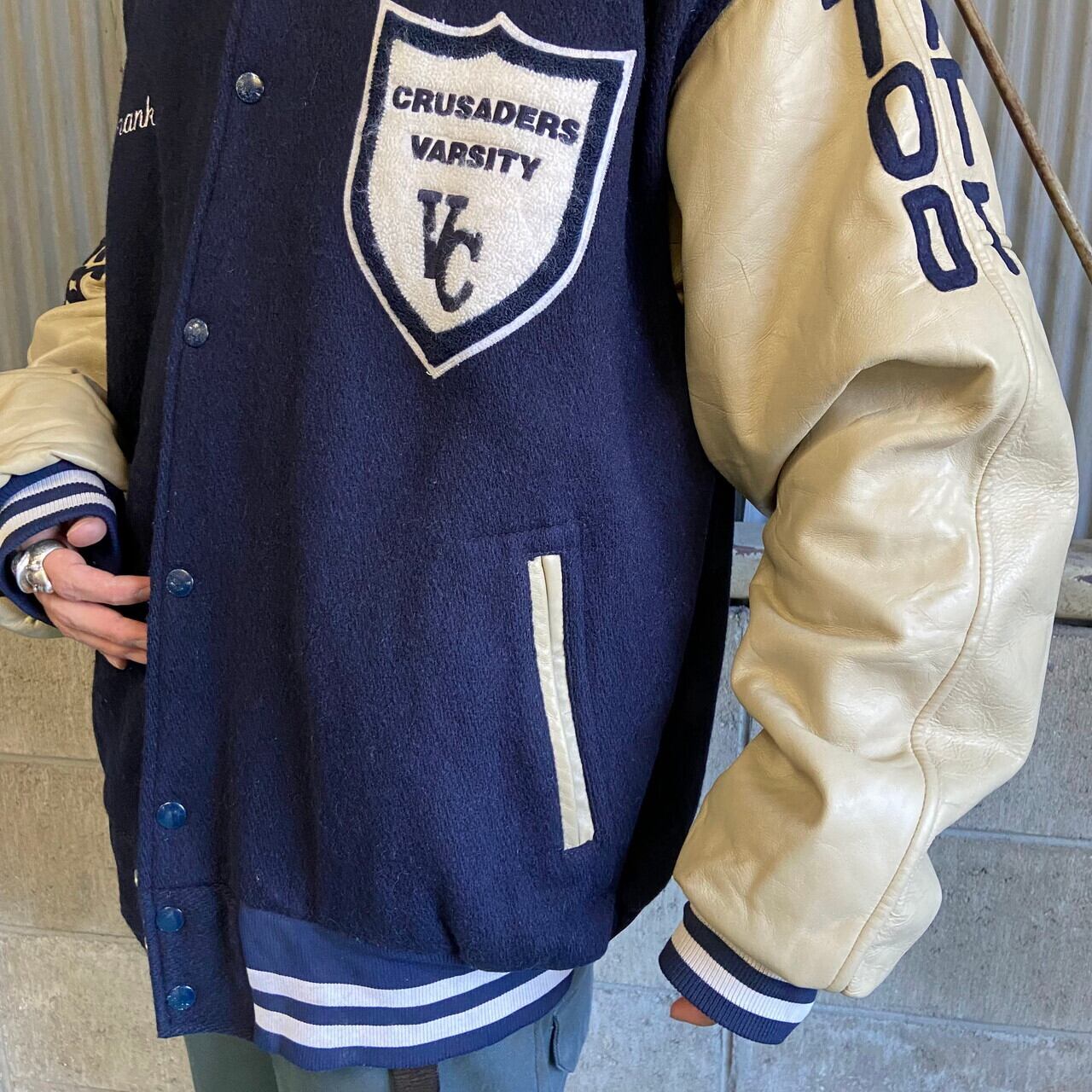 ビッグサイズ USA製 GORGA ウイングフット 袖レザー ウールスタジャン ワッペン メンズ2XL相当 古着 アワードジャケット ヴィンテージ ビンテージ ネイビー 紺色 アイボリー 大きいサイズ【ナイロンジャケット】