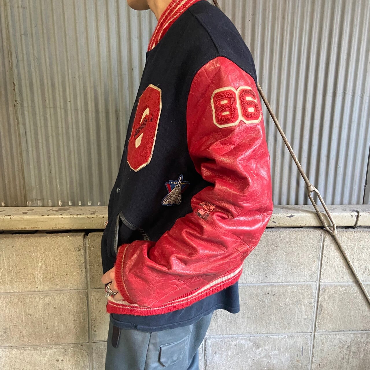 80年代 USA製 TROPHY JACKET 袖レザー ウールスタジャン ワッペン チェーン刺繍 メンズL 古着 アワードジャケット 80s ヴィンテージ ビンテージ 【ナイロンジャケット】