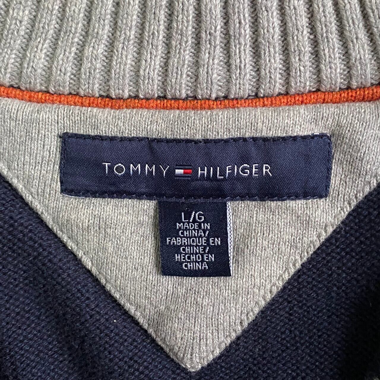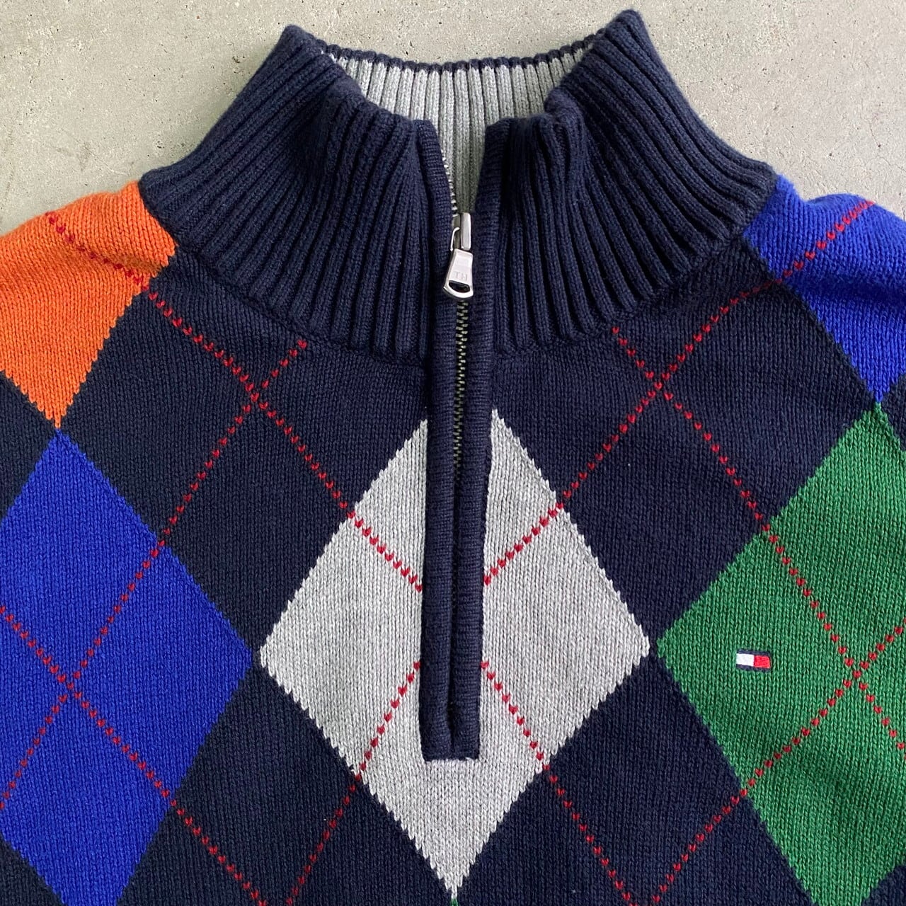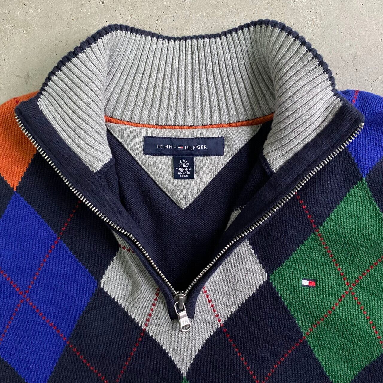 TOMMY HILFIGER トミーヒルフィガー アーガイル柄 ハーフジップ ハイネック コットンニットセーター メンズL 古着 ワンポイントロゴ刺? ネイビー 紺 【ニットセーター】
