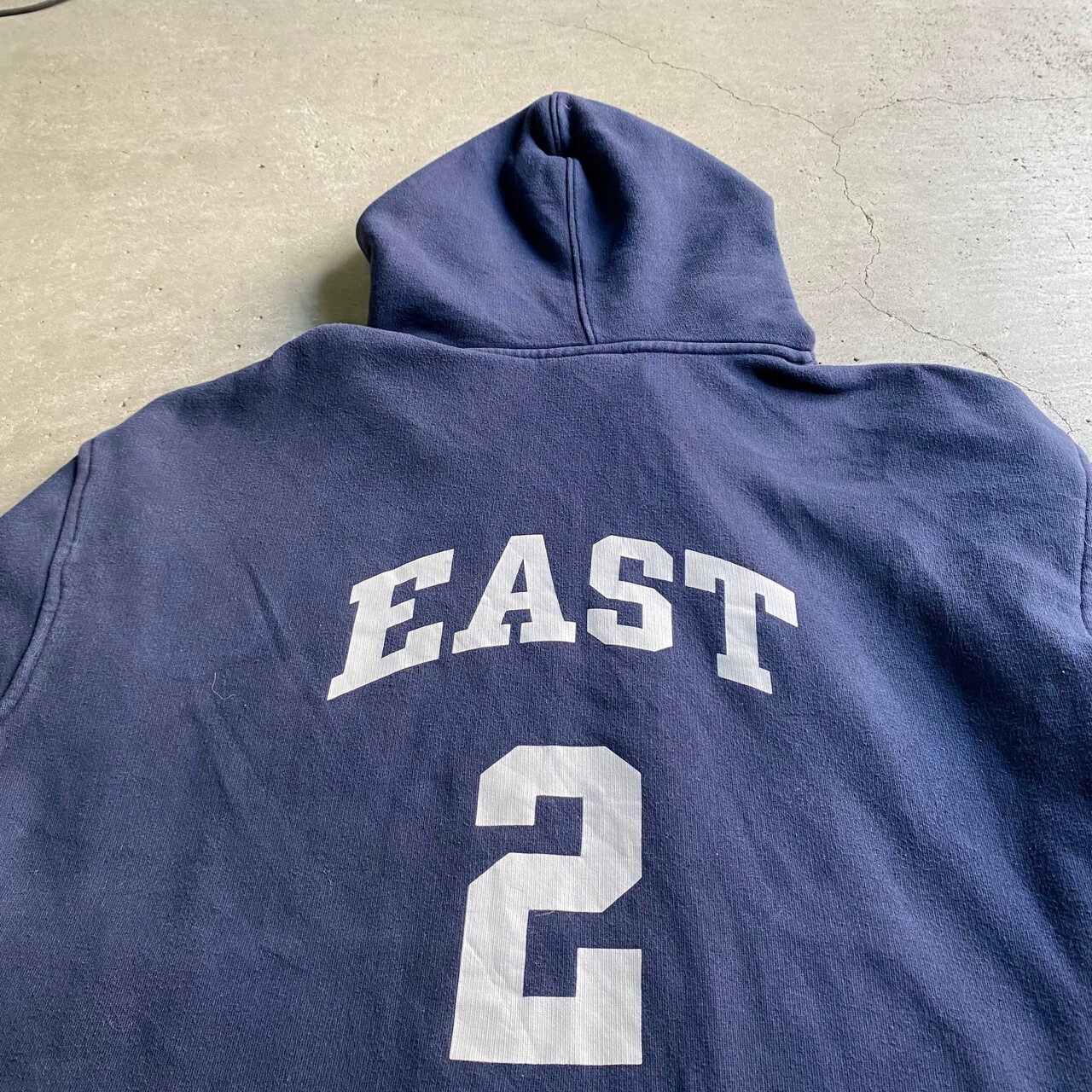 NIKE ナイキ スウォッシュ ワンポイント刺? ナンバリング バックプリント プルオーバーパーカー メンズL 古着 スウェットパーカー切替 ネイビー 紺【パーカー】