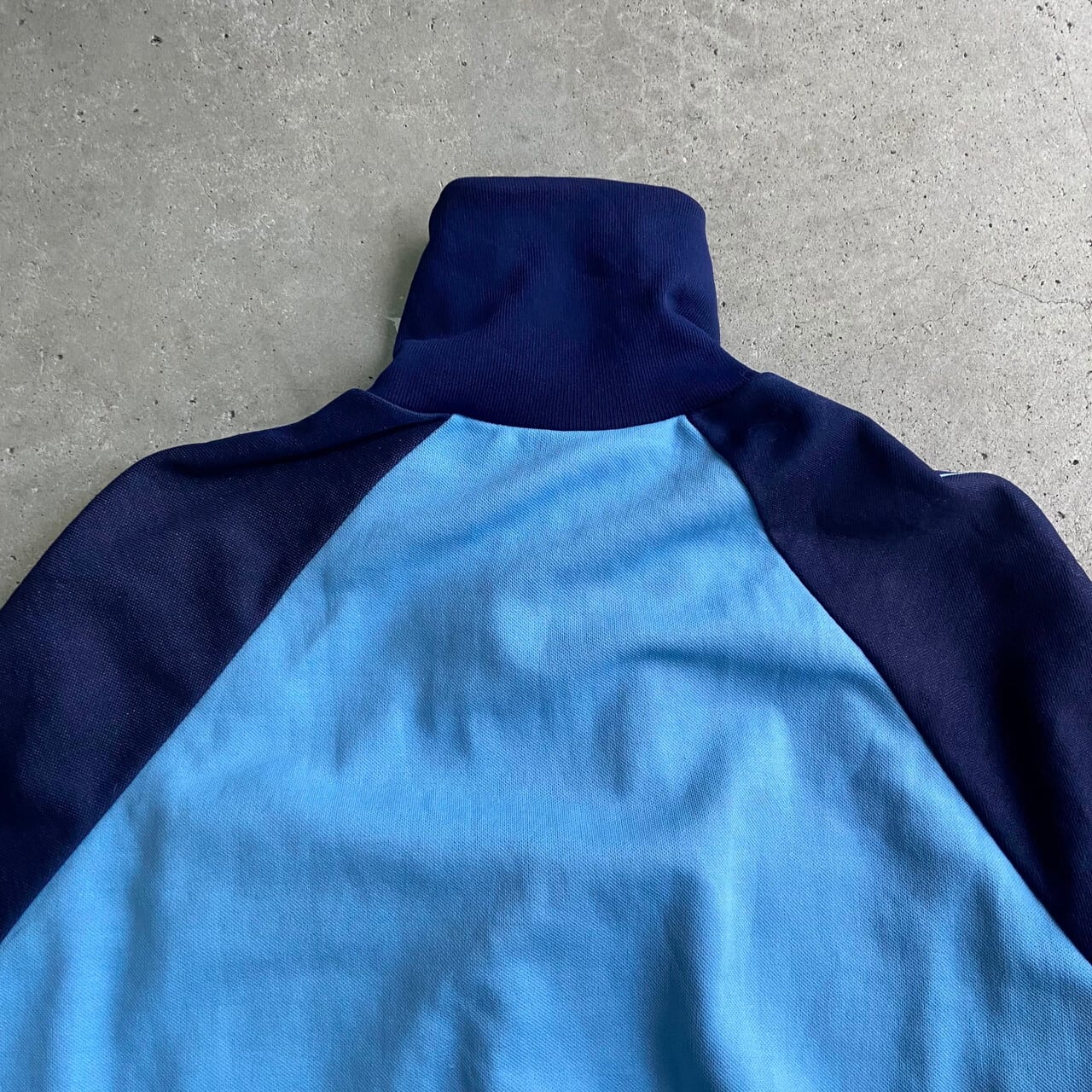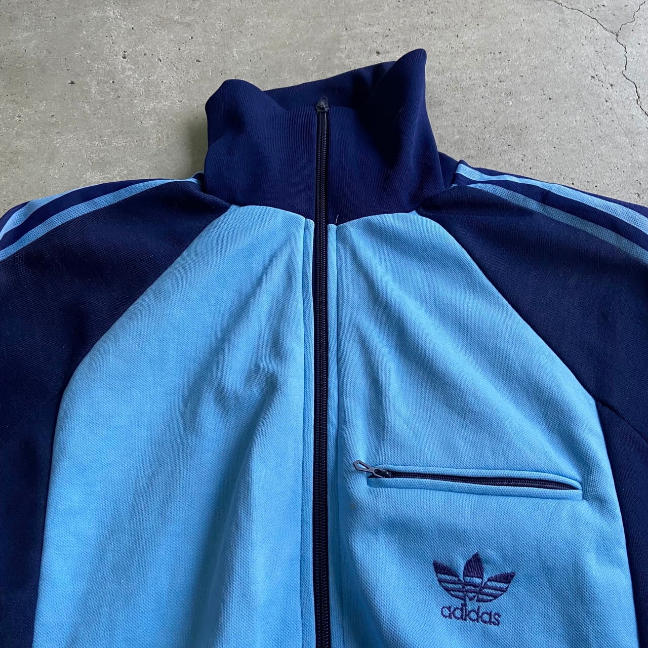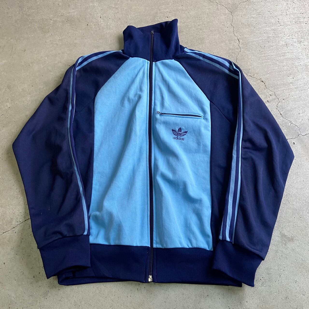 70年代 フランス製 VENTEX社製 adidas アディダス ハイネック 切り替えデザイン ジャージ トラックジャケット メンズM相当 古着 70s ヴィンテージ ビンテージ ライトブルー ネイビー 水色 紺色【ジャージ・トラックジャケット】【VTG】