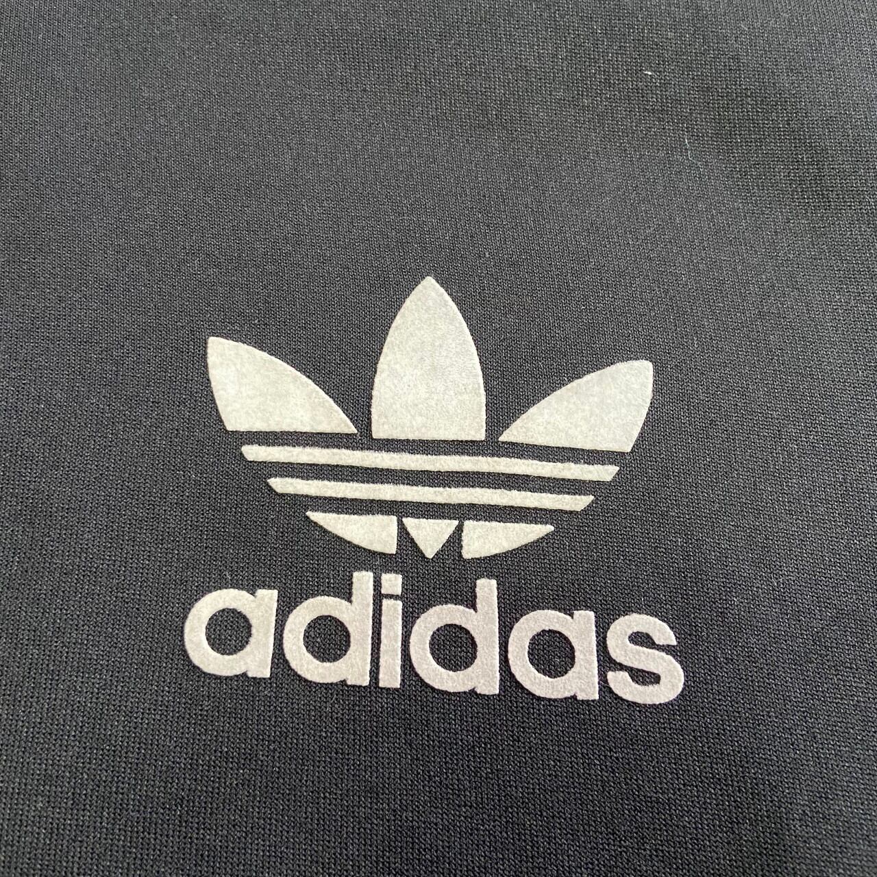 adidas アディダス トレフォイルロゴ フロッキープリント ジャージパーカー メンズL 古着 フルジップパーカー 袖ライン ブラック 黒 【ジャージ・トラックジャケット】
