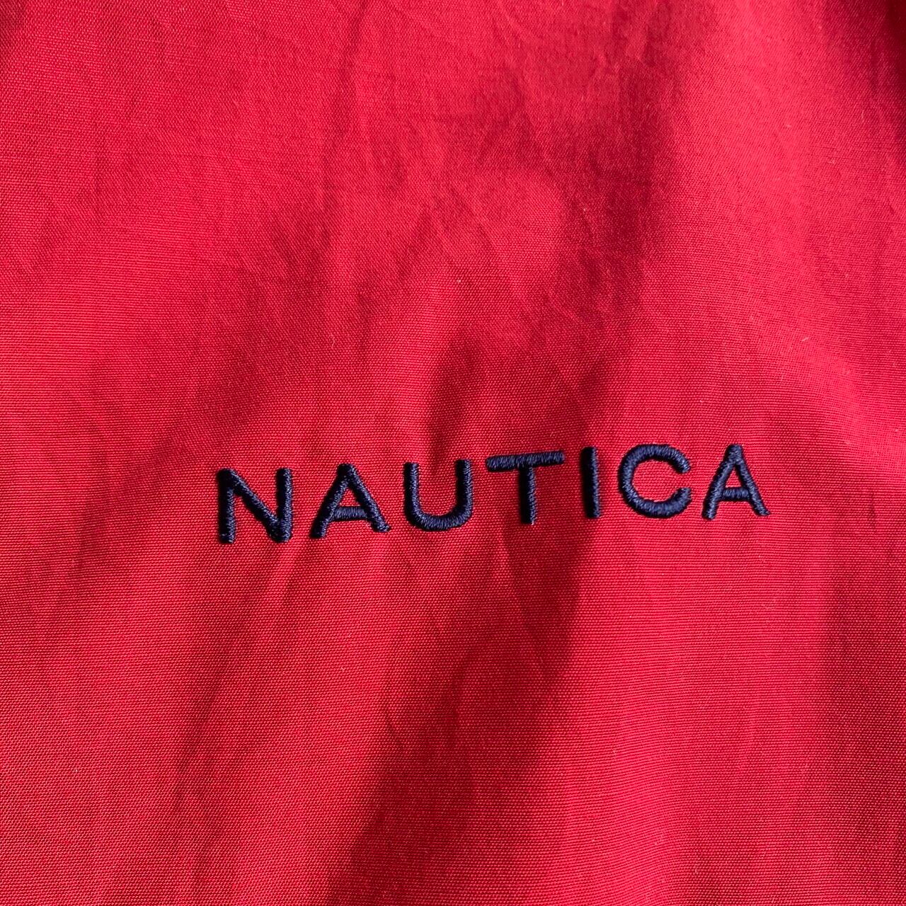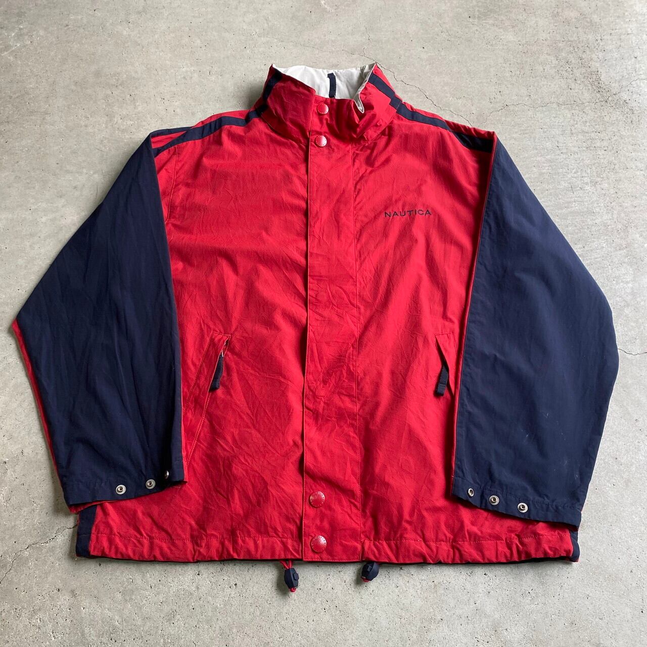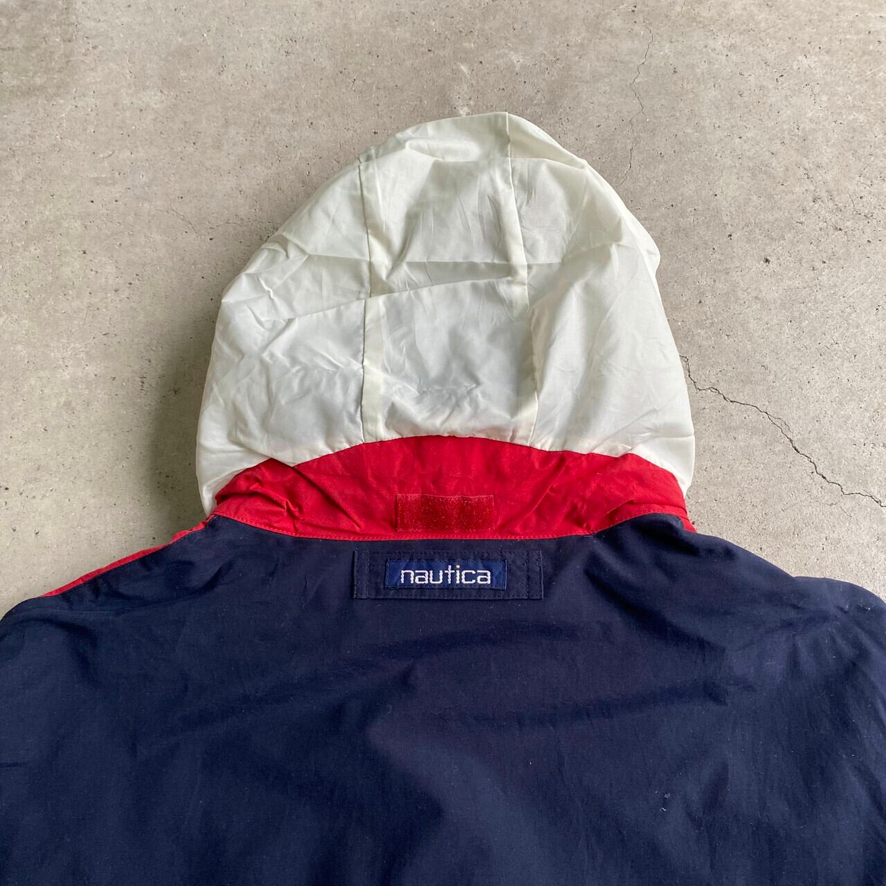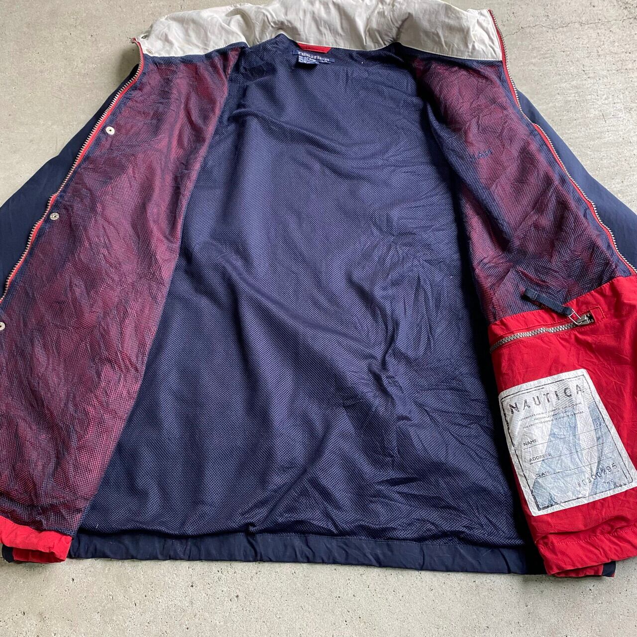 90年代 nautica ノーティカ ナイロン×コットン フード収納型 マウンテンジャケット メンズL 古着 90s ビンテージ ヴィンテージ ハイネック メッシュライナー レッド×ネイビー 赤色 紺色 【アウトドアジャケット】【WS2201】-1