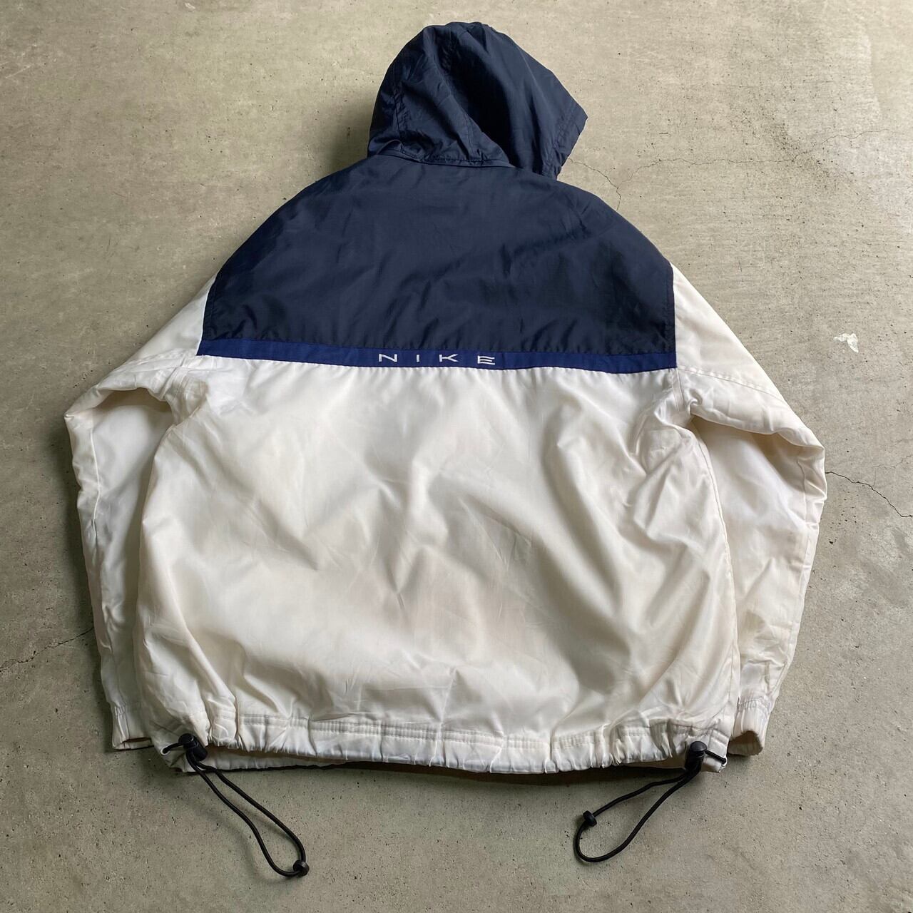 90年代 ビンテージ NIKE ナイキ 中綿 ナイロンジャケット メンズM相当 スウォッシュ フード着脱式 古着 90s ヴィンテージ ホワイト×ネイビー 白 紺【ナイロンジャケット】【WS2201】