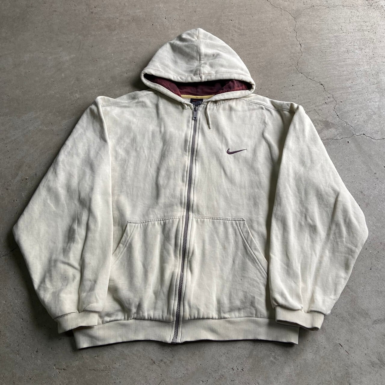 ■90年代 NIKE ナイキ スモールスウォッシュ ワンポイントロゴ刺繍 タイダイ ブリーチ フルジップパーカー メンズL 古着 スウェットパーカー ペールイエロー 黄色 90s ヴィンテージ ビンテージ【パーカー】