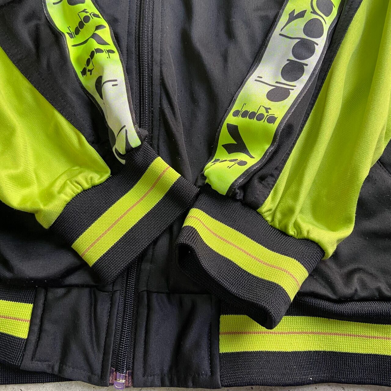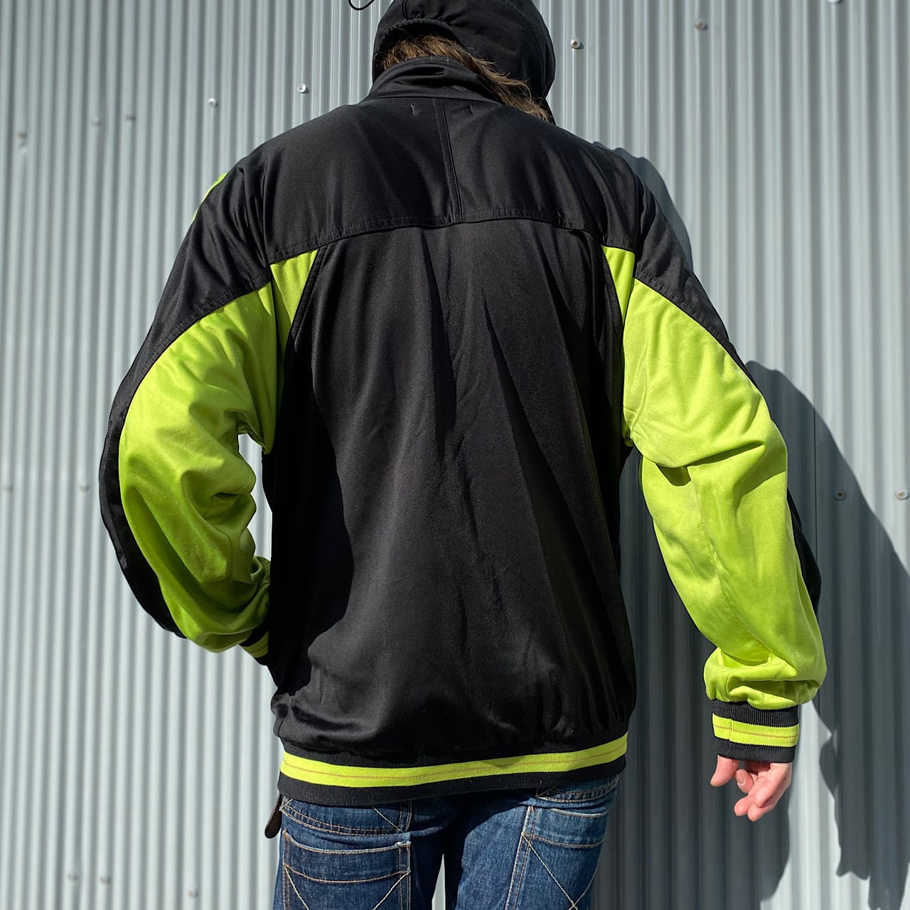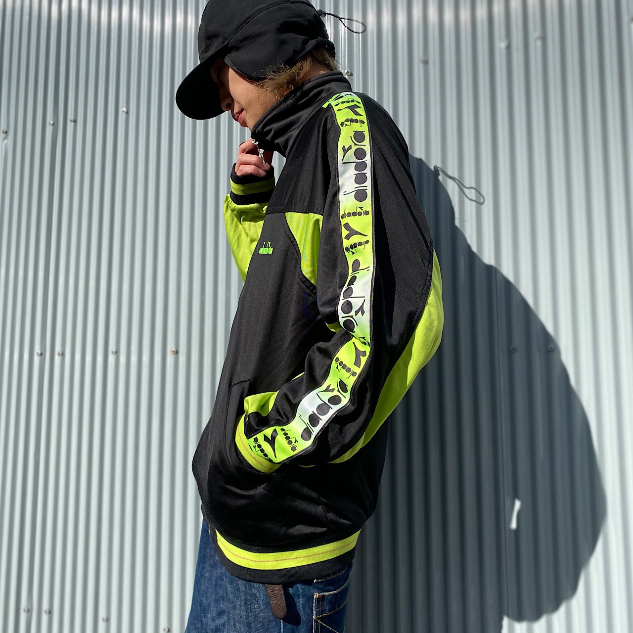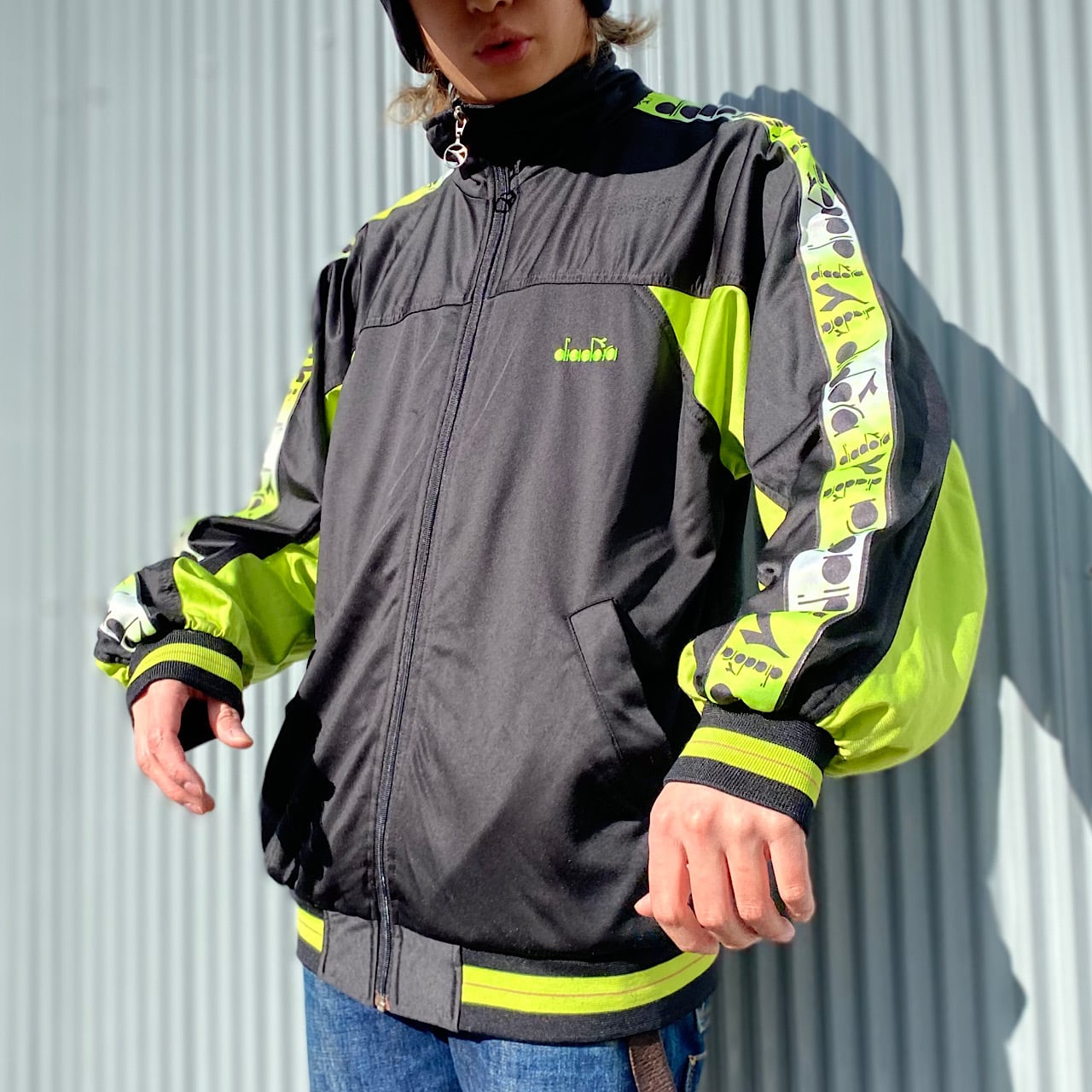 90年代 DIADORA ディアドラ サイドライン バイカラー トラックジャケット メンズ2XL ワンポイントロゴ刺繍 古着 90s ヴィンテージ ビンテージ ブラック ライムグリーン 黒 緑色【ジャージ・トラックジャケット】【WS2202-15】