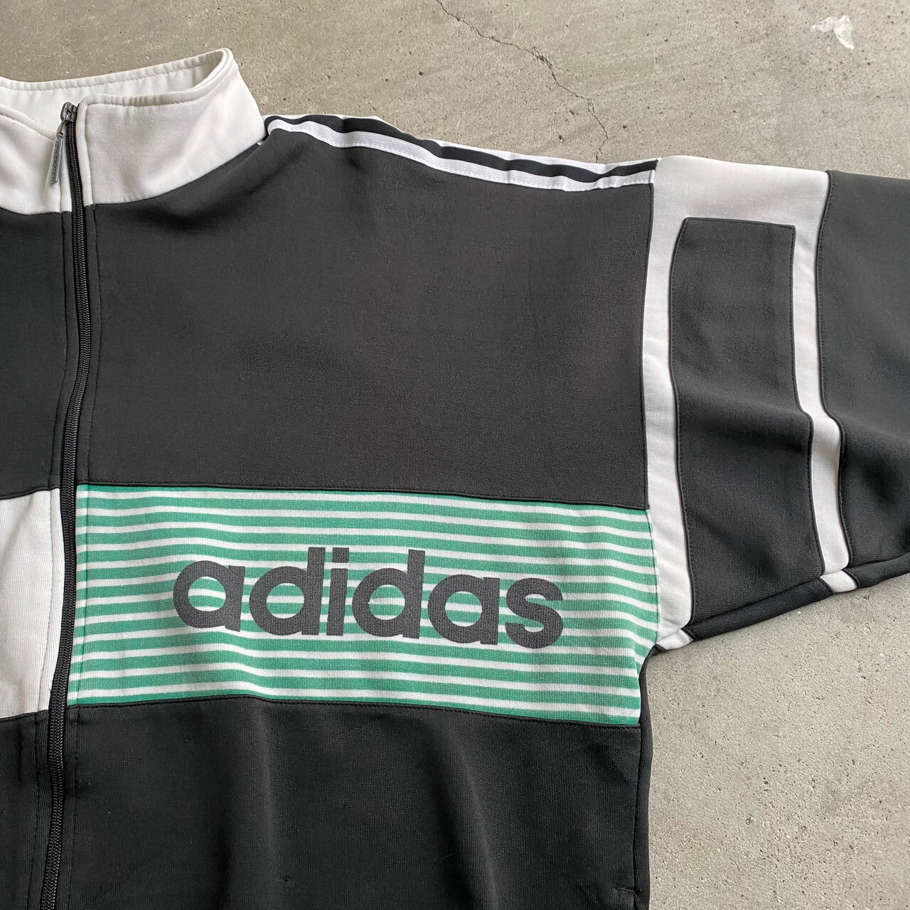 ビッグサイズ 80年代 adidas アディダストラックジャケット メンズXL相当 古着 ジャージ 80s ビンテージ ヴィンテージ ブラック 黒色 フロントロゴ プリント【ジャージ・トラックジャケット】